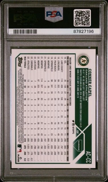 Elevate your sports memorabilia collection with the 2023 Topps Chrome Update Conner Capel Rookie Card. This coveted piece features the promising talent of Conner Capel, adorned with the official seal of the Oakland Athletics. The chrome parallel variety adds a sleek finish, making it a standout addition. Authentically autographed by Conner Capel himself, the signature is verified by Topps and showcased on a label or sticker. This card, numbered AC-CC, is a must-have for baseball enthusiasts and collectors alike, capturing the essence of the 2023 MLB season.
