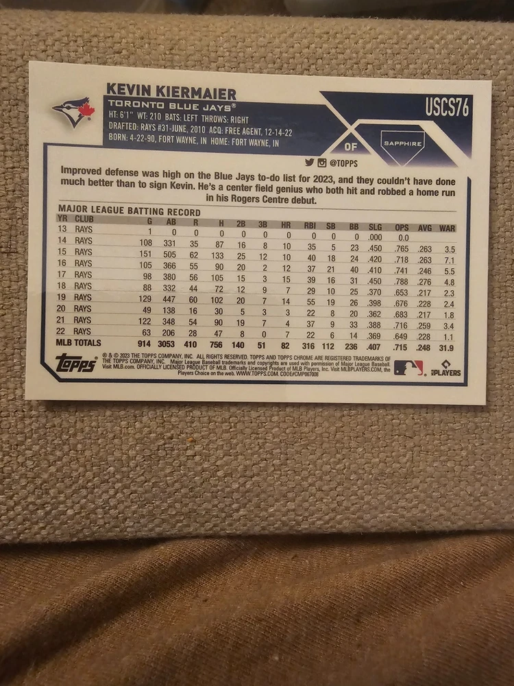 Card Number: USCS76 Season: 2023 Sport: Baseball Parallel/Variety: Sapphire Manufacturer: Topps Team: Los Angeles Dodgers, Toronto Blue Jays League: Major League Baseball (MLB) Player/Athlete: Kevin Kiermaier Type: Sports Trading Card Features: Base Set Set: 2023 Topps Chrome Update Series Sapphire Edition