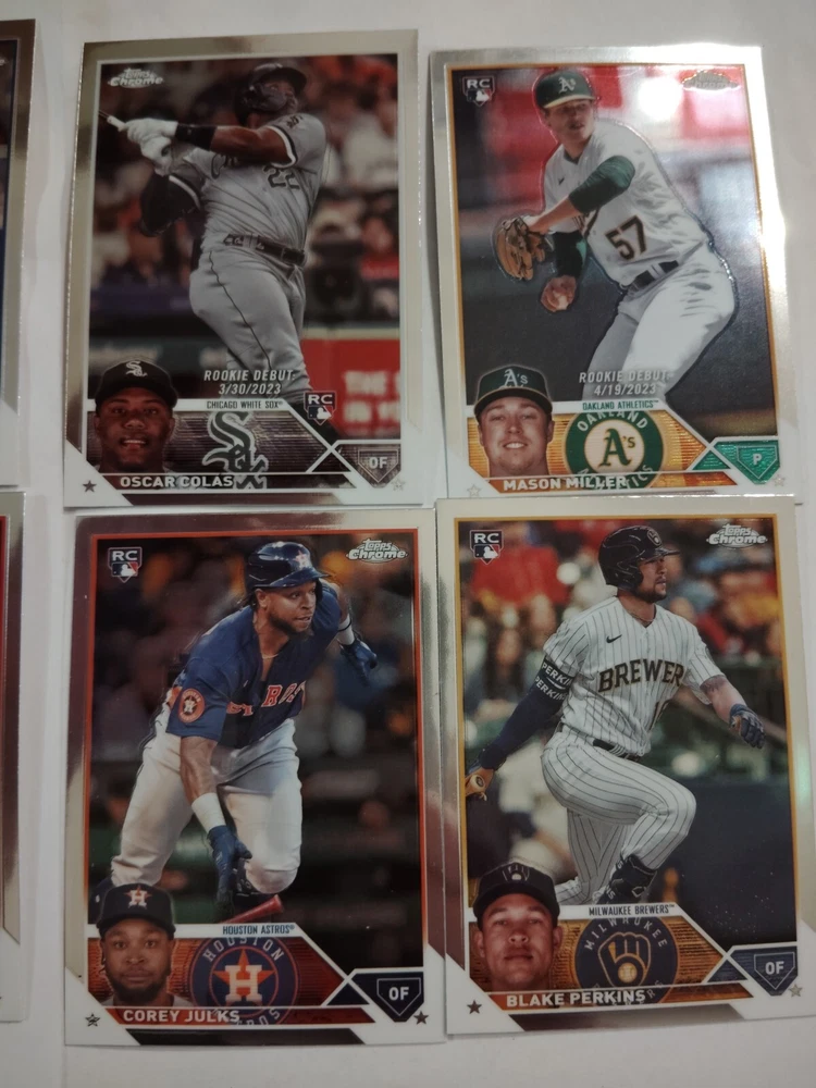 This 10-card lot from the 2023 Topps Chrome update set features rookie players from various Major League Baseball teams, including the Oakland Athletics, Chicago White Sox, and Seattle Mariners. Each card is made of sturdy card stock and showcases the player's stats and picture. The lot includes players such as Dylan Dood, Mason Miller, Corey Julks, Blake Perkins, Joey Ortiz, Casey Y Legumina, Juan Then, Oscar Colas, Brewer Hicklen, and Edouard Julien. These cards are original and not autographed. Perfect for any baseball fan or collector, this lot is a great addition to any sports trading card collection.