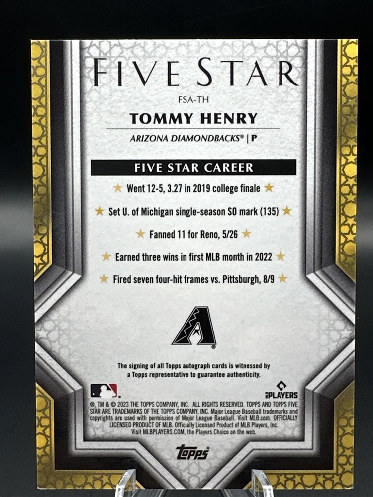 This is a rare opportunity to own a 2023 Topps Five Star Autographed Trading Card featuring Tommy Henry, player for the Arizona Diamondbacks. The card is a Hard Signed format and is an Original piece manufactured by Topps. It is a Parallel/Variety card with a unique Signature designation. The card is made from high-quality Paperboard and Card Stock materials and features a Bowman size. It is a Major League (MLB) Baseball card with the card number #FSA-TH. The card is an Insert and also includes Memorabilia from the player. It is a great addition to any Sports Trading Card collection.