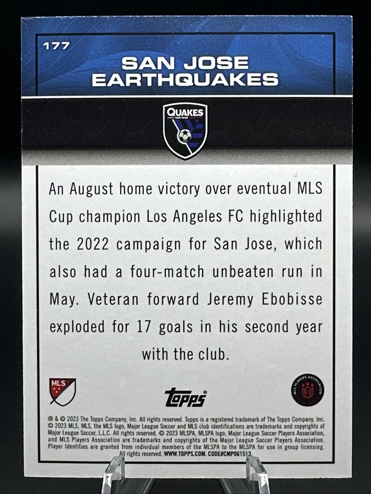 This 2023 Topps MLS Team Card Blue Foil is a must-have for any soccer fan and collector. It features the San Jose Earthquakes team and is an original card with a print run of 27/99. The card is made of high-quality card stock and has a parallel variety with a blue foil design. The card is part of the 2023 Topps MLS set and is an insert with a serial number. It is also an original card and not a licensed reprint. The card features the Earthquakes team logo and name, and is in English language. This card is perfect for any fan of the Major League Soccer and collectors of sports trading cards.