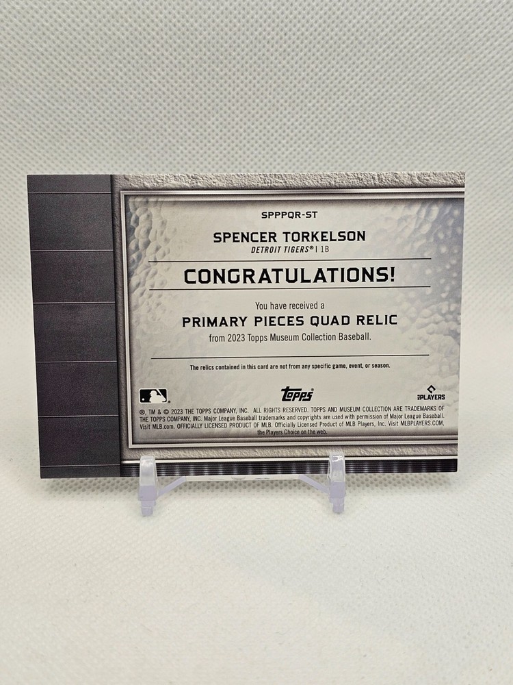 You are bidding on a 2023 Topps Museum Collection Primary Pieces Quad Relic Spencer Torkelson card numbered 82/99 featuring game used memorabilia. FREE SHIPPING Card is from personal collection and has been handled with extreme care. Please message for additional photos, information, offers, etc. Card is in a penny sleeve, top loader, and will be shipped with protection in a bubble maker mailer to ensure card arrives to buyer in excellent condition. Good luck and happy bidding!