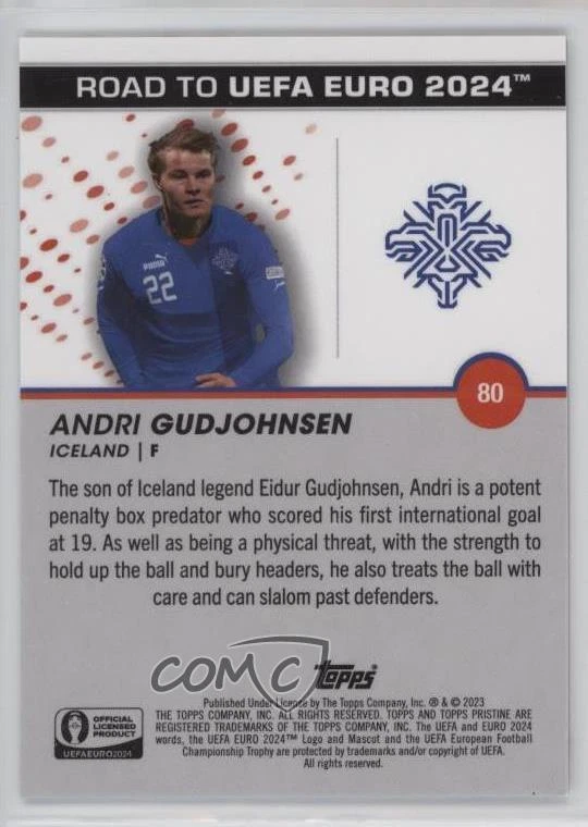 2023 Topps Pristine Road to UEFA Euro 2024 - [Base] - Blue Refractor #80 Andri Gudjohnsen Qty Made: 75 - Soccer Card - Featuring the Iceland - Featuring Andri Gudjohnsen Search for more: 2023 Topps Pristine Road to UEFA Euro 2024 Search for more: 2023 Topps Pristine Road to UEFA Euro 2024 - [Base] - Blue Refractor View all of our Listings Auctions Buy It Now About Us Located in the beautiful Pacific Northwest, COMC (Check Out My Cards) is the world's largest consignment service for trading card singles. More than 10,000 people have used our consignment service to list over 50 million trading cards. We currently house 20 million cards, each listed for sale with front and back images of the actual card. Find out how we can help you consign your items on eBay by contacting us through eBay messaging. COMC -- "The Safe & Easy Way to Buy & Sell" Representative Image - Select Specific Item above to see image of actual item Representative Image - Select Specific Item above to see image of actual item Raw Condition for Modern Cards Unless otherwise noted, raw modern cards are listed in Near Mint-Mint condition or better. A NM-MT card appears to be Mint at first glance, but upon closer inspection, may exhibit some of the following: minor print defects (e.g. roller marks, print line, dimple), minor scratches, slight edge wear, and slight corner wear. Centering is clearly visible in the images provided and does not factor into our condition assessment. Raw Condition for Vintage Cards Unless otherwise noted, raw vintage cards are listed in Excellent condition or better. An EX card may exhibit some of the following: minor rounding of corners, surface wear, print defects, light scratches, and slight edge wear/chipping. Centering is clearly visible in the images provided and does not factor into our condition assessment. Domestic Shipping Combined shipping for multiple items is available. To receive combined shipping, please ensure all desired items are in your eBay shopping cart before proceeding to checkout. eBay limits orders to 40 items per order. We automatically combine multiple orders placed on the same day. If you place multiple orders on the same day, please contact us to request a refund of applicable shipping costs. Signature confirmation may be required on invoices over $400. Raw cards are shipped in toploaders. International Shipping COMC offers eBay's International Shipping (EIS) for international orders under $2,500* (see country exceptions below). All duties and import fees are paid at checkout; in the rare event that there are additional import fees upon delivery, these are borne by the buyer. EIS packages route through a shipping hub in Erlanger, KY before shipping to their final destination. Please note that EIS does not allow for combined shipments. The shipping rates are determined by eBay and cannot be adjusted. *Maximum sale price exceptions: Colombia, Kuwait ($2,000); Taiwan ($1,539); Chile, Costa Rica, Guatemala, Honduras, Trinidad and Tobago ($1,000); Antigua and Barbuda, Aruba, Belize, Dominica, Grenada, Philippines, Saint Kitts and Nevis, Saint Lucia, Montserrat, Turks and Caicos Islands ($500); Dominican Republic, El Salvador ($200). Please request a shipping quote through eBay messaging for orders that exceed the maximum sale price supported by eBay's International Shipping. You will be responsible for all duties and import fees for international orders shipped outside the EIS. Raw cards are shipped in toploaders. Payment COMC does not accept offers on our cards through our eBay storefront. COMC utilizes eBay’s managed payments system. If you are experiencing difficulties making a payment, please contact eBay for assistance. Return Policy Returns are only accepted on the rare occasion the item is not as described. If you are making a return, please initiate the return process through eBay so a mailing label can be provided for you. Prior to listing, our expert team carefully assessed this item to represent it accurately. Please review the description and high-definition images prior to purchasing to ensure this item meets your satisfaction. We welcome you to contact us if you have further questions about this item. Trust and Integrity COMC carefully assesses each item consigned to us to prevent fraudulent items from entering the marketplace. If you believe an item offered on COMC may be fraudulent, please contact us with details so we can investigate the issue. Items we determine are outside our supported items policy may be removed. Last Modified: 12/3/2024 11:24:23 AM PDT