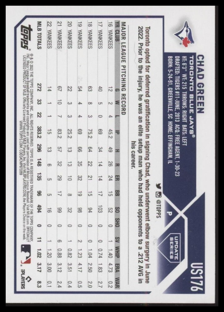 This is a nice example of a 2023 Topps Update #US176 Chad Green Orange and Black Foil Other important information about this card: In 2023 Chad Green played for the Toronto Blue Jays. Please check out our other listings for more great cards.