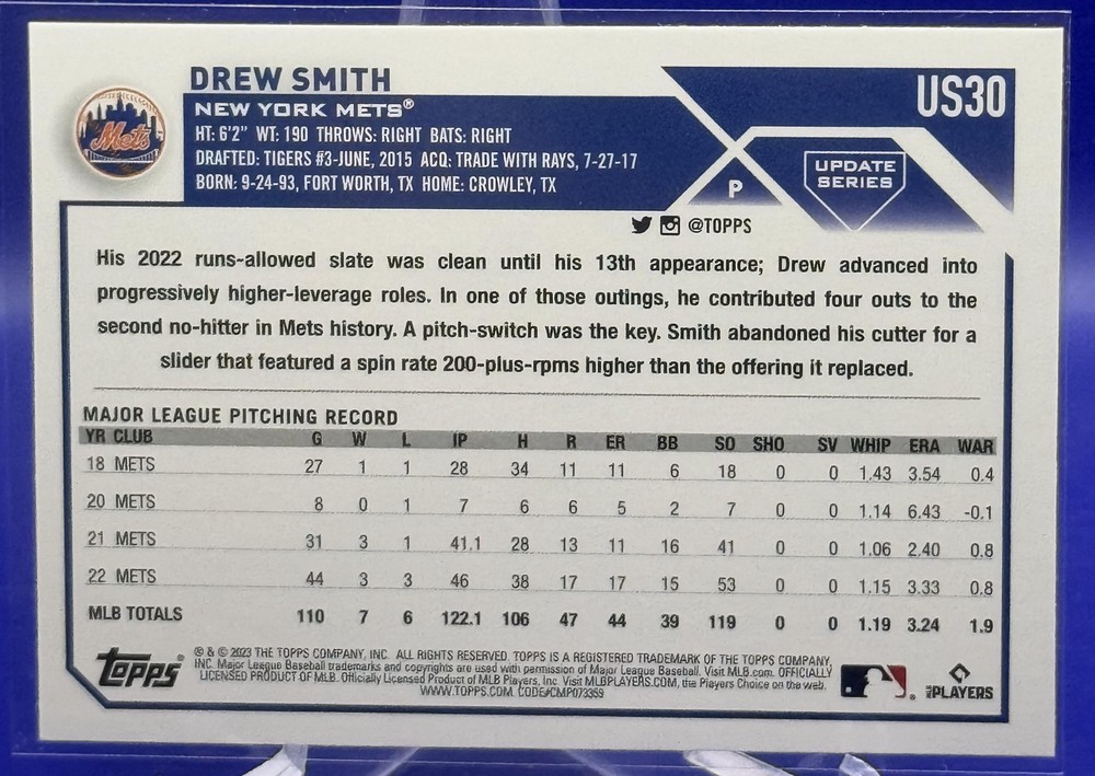 The Card pictured is the card you will receive unless there are multiple quantities then you will receive a card in the comparable grade. Cards in poor condition could have creasing, stains, rounded corners, pen marks or a combo of them. please see pics for a better understanding of cards condition. Excellent New York Mets Orange and Black Foil Drew Smith #US30 2023 Topps Update Topps 2023 Baseball .