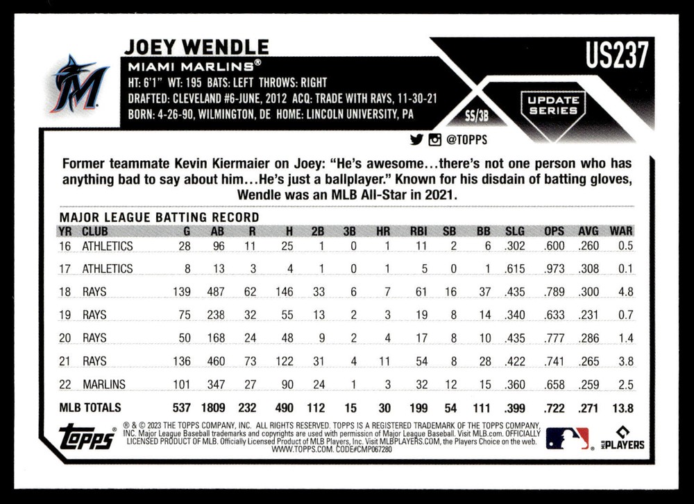 The Card pictured is the card you will receive unless there are multiple quantities then you will receive a card in the comparable grade. Cards in poor condition could have creasing, stains, rounded corners, pen marks or a combo of them. please see pics for a better understanding of cards condition. Excellent Miami Marlins Royal Blue Joey Wendle #US237 2023 Topps Update Topps 2023 Baseball .
