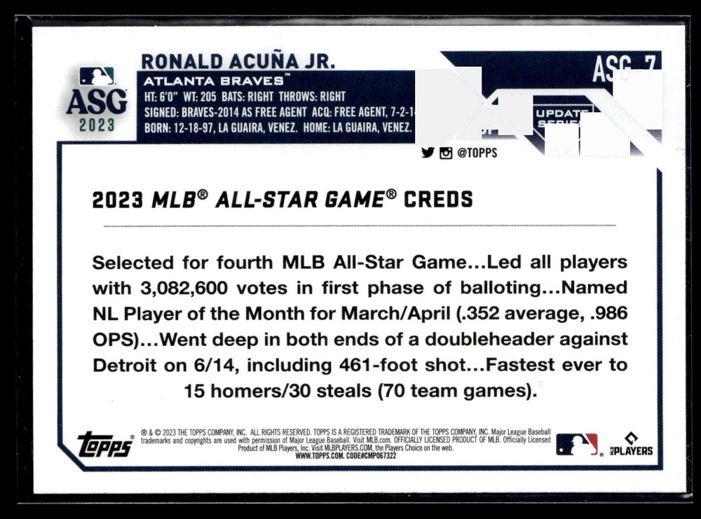 The Card pictured is the card you will receive unless there are multiple quantities then you will receive a card in the comparable grade. Cards in poor condition could have creasing, stains, rounded corners, pen marks or a combo of them. please see pics for a better understanding of cards condition. Excellent Atlanta Braves 2023 All-Star Game Ronald Acuña Jr. #ASG-7 2023 Topps Update Topps 2023 Baseball .