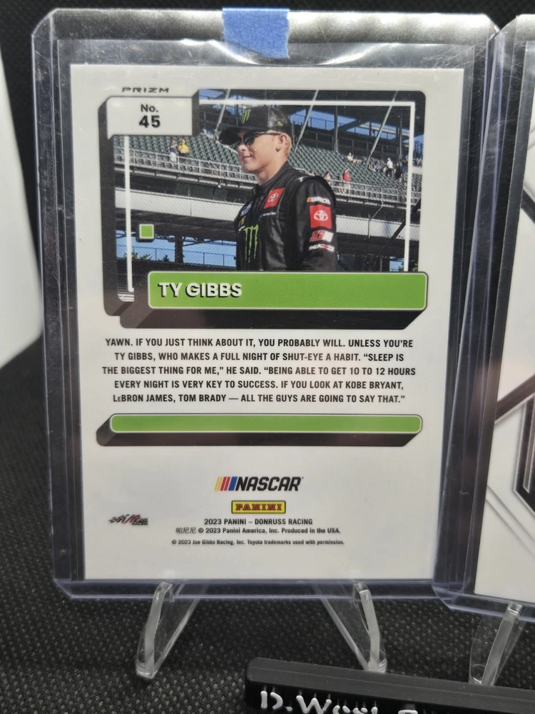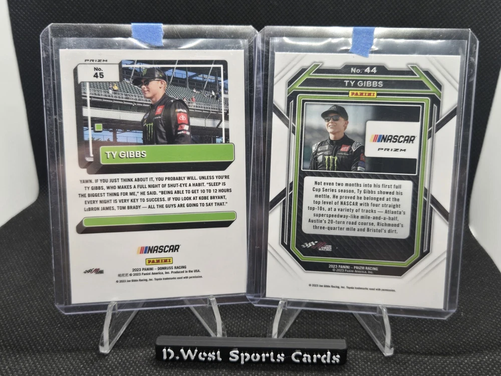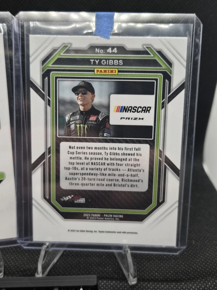 Manufacturer: Panini Year Manufactured: 2023 League: NASCAR Features: Rookie, Parallel, Insert, Chase, Hologram, Short Print Type: Sports Trading Card Player/Athlete: Ty Gibbs Sport: Auto Racing Season: 2023 Number of Cards: 2