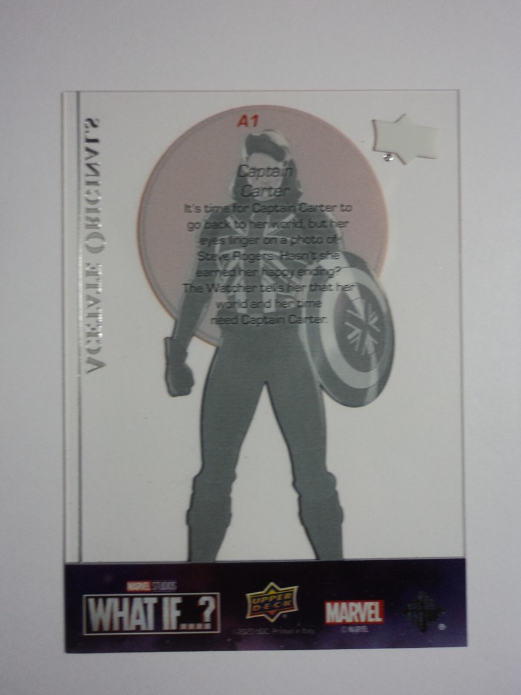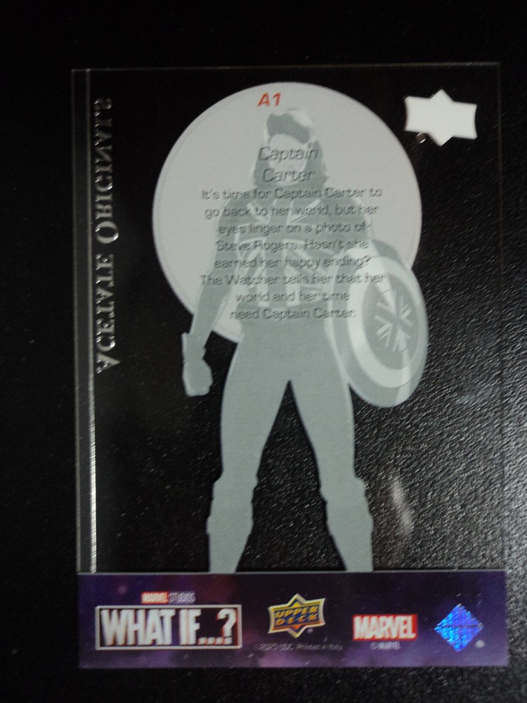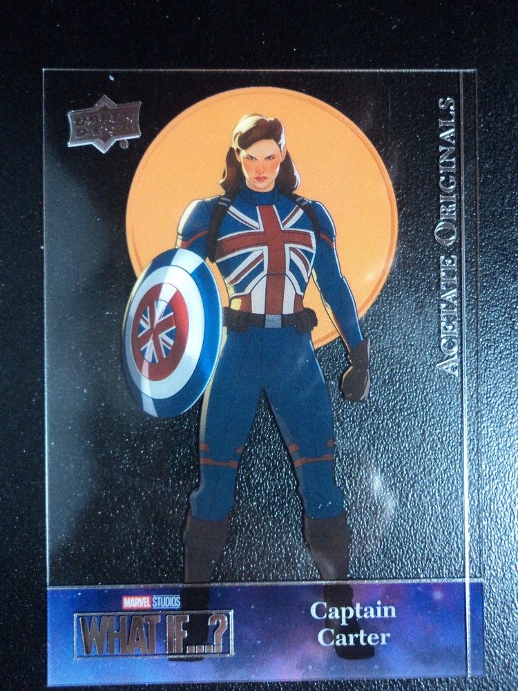 Autographed: No Original/Licensed Reprint: Original Card Number: A1 2023 UPPER DECK MARVEL WHAT IF?: CHASE CARD - ACETATE ORIGINALS - A1 CAPTAIN CARTER Vintage: No Card Name: CAPTAIN CARTER Material: Card Stock Age Level: 13+ Language: English Year Manufactured: 2023 Card Size: Standard Genre: Superhero Manufacturer: Upper Deck Character: Captain Carter Features: Chase, Insert Set: 2023 UPPER DECK MARVEL WHAT IF? TV Show: Marvel Studios' What If...? Card Thickness: 20 Pt. Type: Non-Sport Trading Card Country/Region of Manufacture: United States Franchise: Marvel (MCU)
