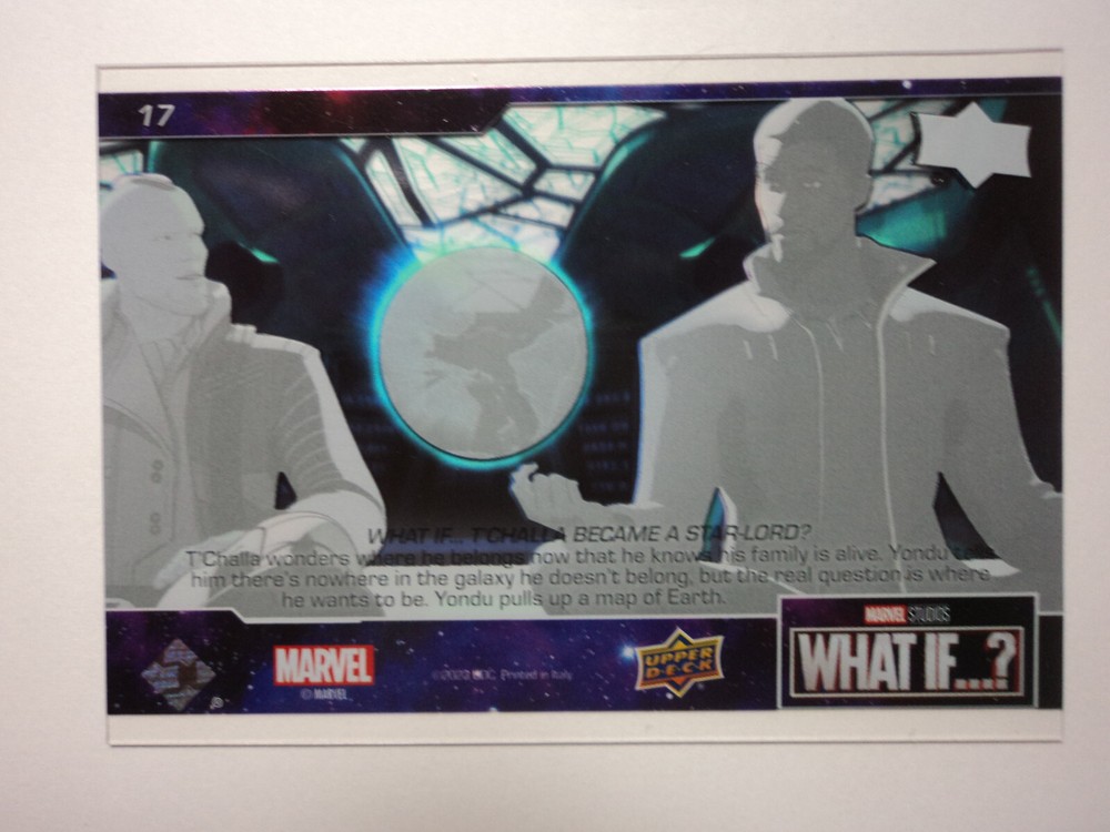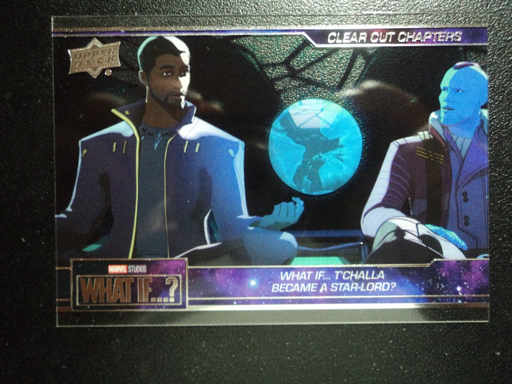 PLEASE DO NOT PAY FOR MULTIPLE PURCHASES SEPARATELY ______________________________________________________________________________________________ Here's what you get: Marvel What If ? - Upper Deck - 2023 CHASE CARD CLEAR CUT CHAPTERS - EPISODE 2 # 17 WHAT IF...T'CHALLA BECAME A STAR-LORD? ______________________________________________________________________________________________ Card stored in a smoke-free home. Payment due within 48 hours of purchase. NOTE: IF PURCHASING FROM MORE THEN ONE LISTING, PLEASE DO NOT PAY FOR THEM SEPARATELY, RATHER REQUEST AN INVOICE FROM ME, OR AWAIT RECEIPT OF AN INVOICE FROM ME BEFORE PAYING. When possible, I will combine shipping and handling. A tracking number will be provided on all First Class and Priority packages. You must have a confirmed eBay mailing address. My goal is to provide excellent service to buyers, so I may earn your business over and over. Any questions, please feel free to e-mail me. Please check out my other listings. Happy Collecting. ______________________________________________________________________________________________