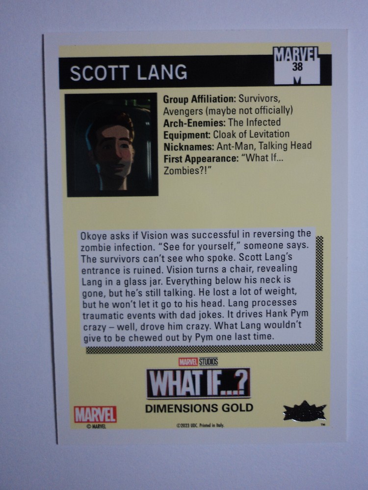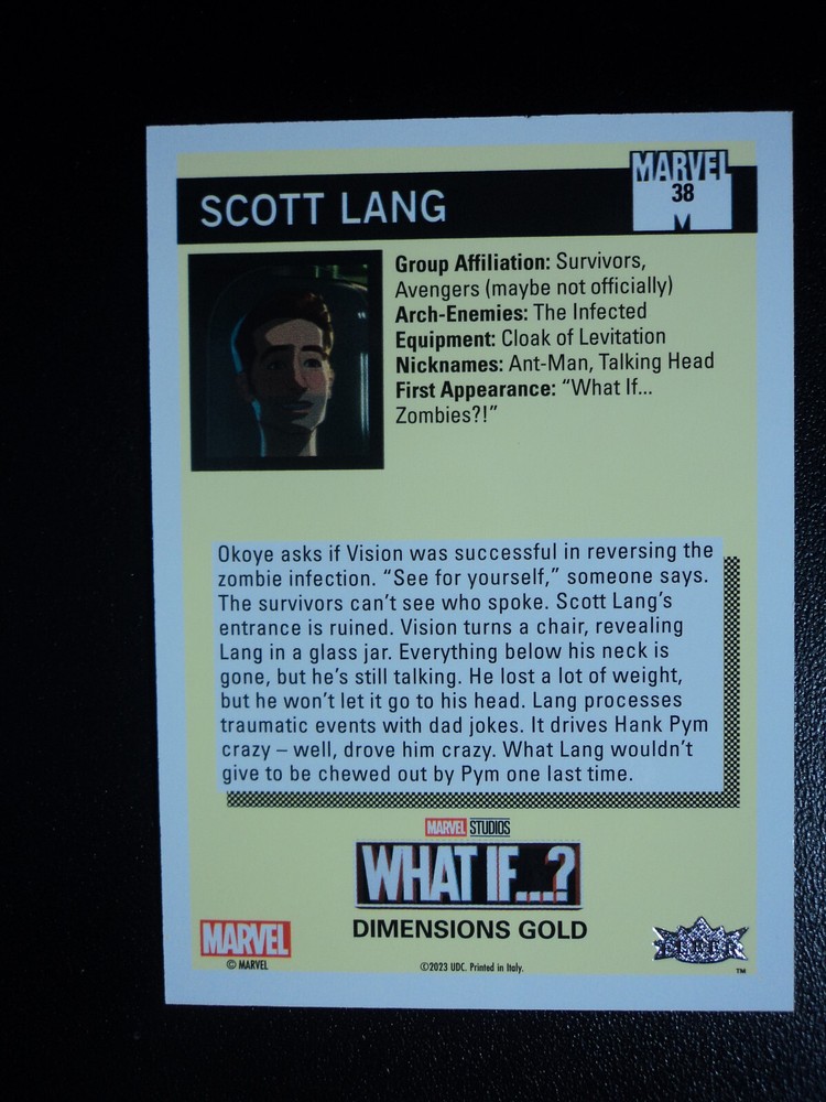 PLEASE DO NOT PAY FOR MULTIPLE PURCHASES SEPARATELY ______________________________________________________________________________________________ Here's what you get: Marvel What If ? - Upper Deck - 2023 CHASE CARD DIMENSIONS GOLD CARD # 38 (360/688) SCOTT LANG ______________________________________________________________________________________________ Card stored in a smoke-free home. Payment due within 48 hours of purchase. NOTE: IF PURCHASING FROM MORE THEN ONE LISTING, PLEASE DO NOT PAY FOR THEM SEPARATELY, RATHER REQUEST AN INVOICE FROM ME, OR AWAIT RECEIPT OF AN INVOICE FROM ME BEFORE PAYING. When possible, I will combine shipping and handling. A tracking number will be provided on all First Class and Priority packages. You must have a confirmed eBay mailing address. My goal is to provide excellent service to buyers, so I may earn your business over and over. Any questions, please feel free to e-mail me. Please check out my other listings. Happy Collecting. ______________________________________________________________________________________________