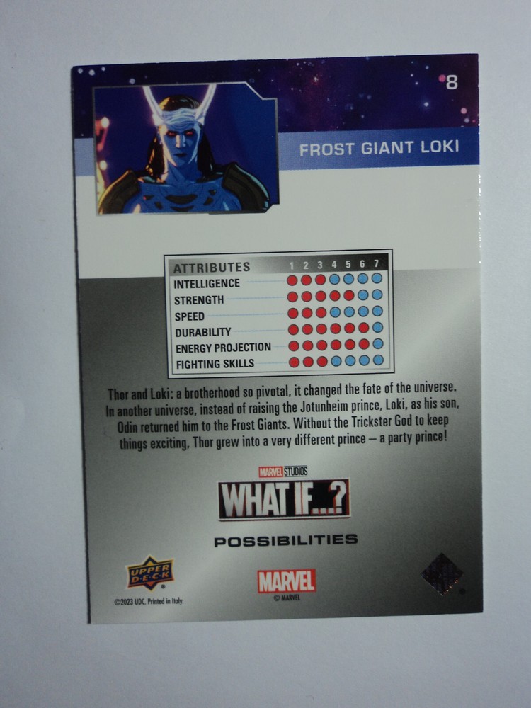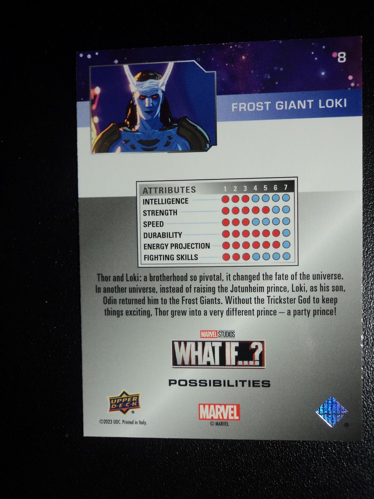 PLEASE DO NOT PAY FOR MULTIPLE PURCHASES SEPARATELY ______________________________________________________________________________________________ Here's what you get: Marvel What If ? - Upper Deck - 2023 CHASE CARD POSSIBILITIES FROST GIANT LOKI # 8 ______________________________________________________________________________________________ Card stored in a smoke-free home. Payment due within 48 hours of purchase. NOTE: IF PURCHASING FROM MORE THEN ONE LISTING, PLEASE DO NOT PAY FOR THEM SEPARATELY, RATHER REQUEST AN INVOICE FROM ME, OR AWAIT RECEIPT OF AN INVOICE FROM ME BEFORE PAYING. When possible, I will combine shipping and handling. A tracking number will be provided on all First Class and Priority packages. You must have a confirmed eBay mailing address. My goal is to provide excellent service to buyers, so I may earn your business over and over. Any questions, please feel free to e-mail me. Please check out my other listings. Happy Collecting. ______________________________________________________________________________________________