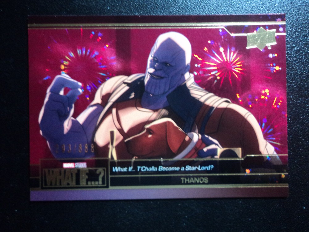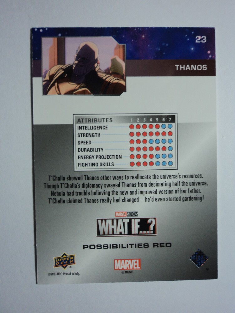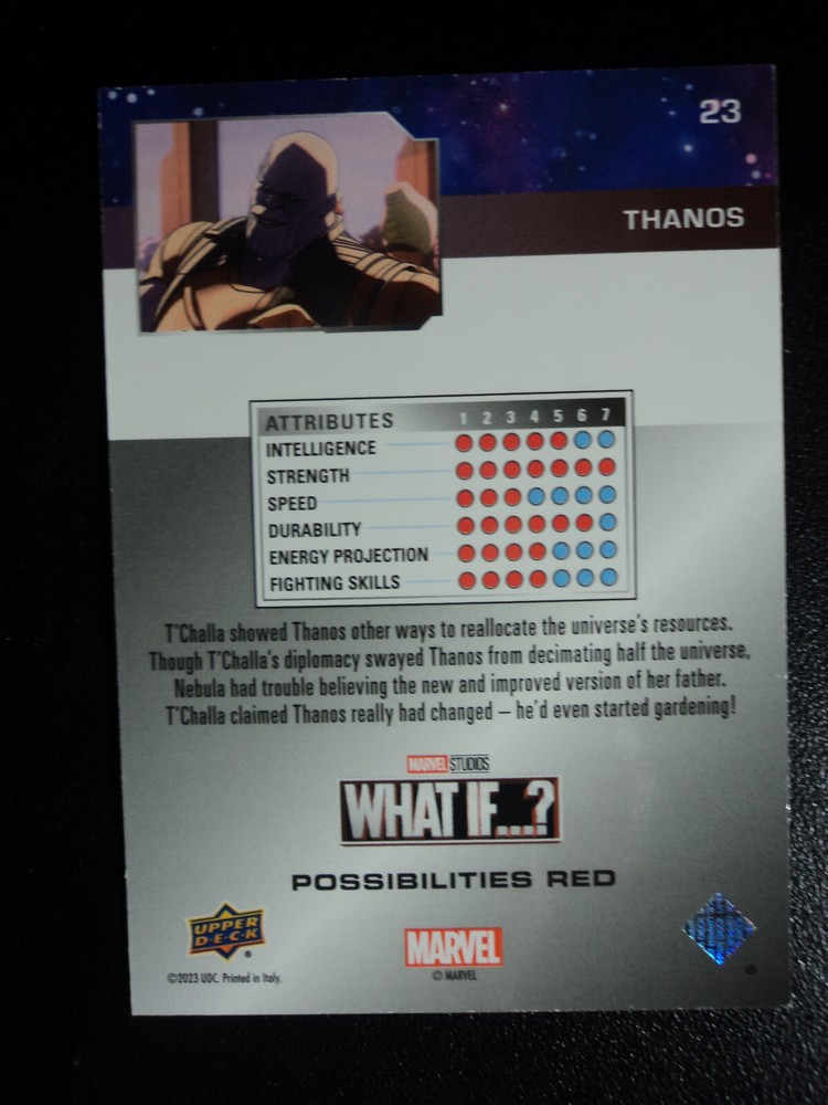 PLEASE DO NOT PAY FOR MULTIPLE PURCHASES SEPARATELY ______________________________________________________________________________________________ Here's what you get: Marvel What If ? - Upper Deck - 2023 CHASE CARD " RED " POSSIBILITIES CARD # 23 THANOS 293/888 ______________________________________________________________________________________________ Card stored in a smoke-free home. Payment due within 48 hours of purchase. NOTE: IF PURCHASING FROM MORE THEN ONE LISTING, PLEASE DO NOT PAY FOR THEM SEPARATELY, RATHER REQUEST AN INVOICE FROM ME, OR AWAIT RECEIPT OF AN INVOICE FROM ME BEFORE PAYING. When possible, I will combine shipping and handling. A tracking number will be provided on all First Class and Priority packages. You must have a confirmed eBay mailing address. My goal is to provide excellent service to buyers, so I may earn your business over and over. Any questions, please feel free to e-mail me. Please check out my other listings. Happy Collecting. ______________________________________________________________________________________________