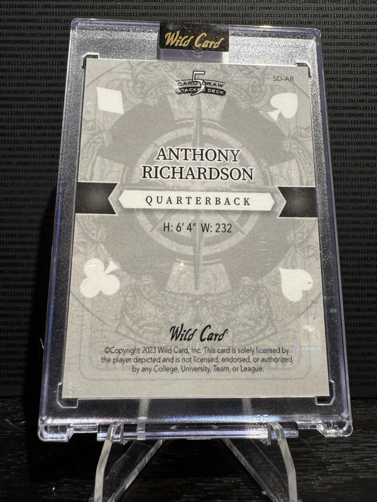 It is a 2023 Wild Card trading card featuring Anthony Richardson of the Indianapolis Colts. This autographed card is a 1/1 Rookie Joker parallel, making it a unique collectible. The card is in near mint or better condition and is part of the 5 Card Draw set.