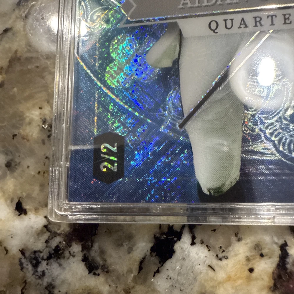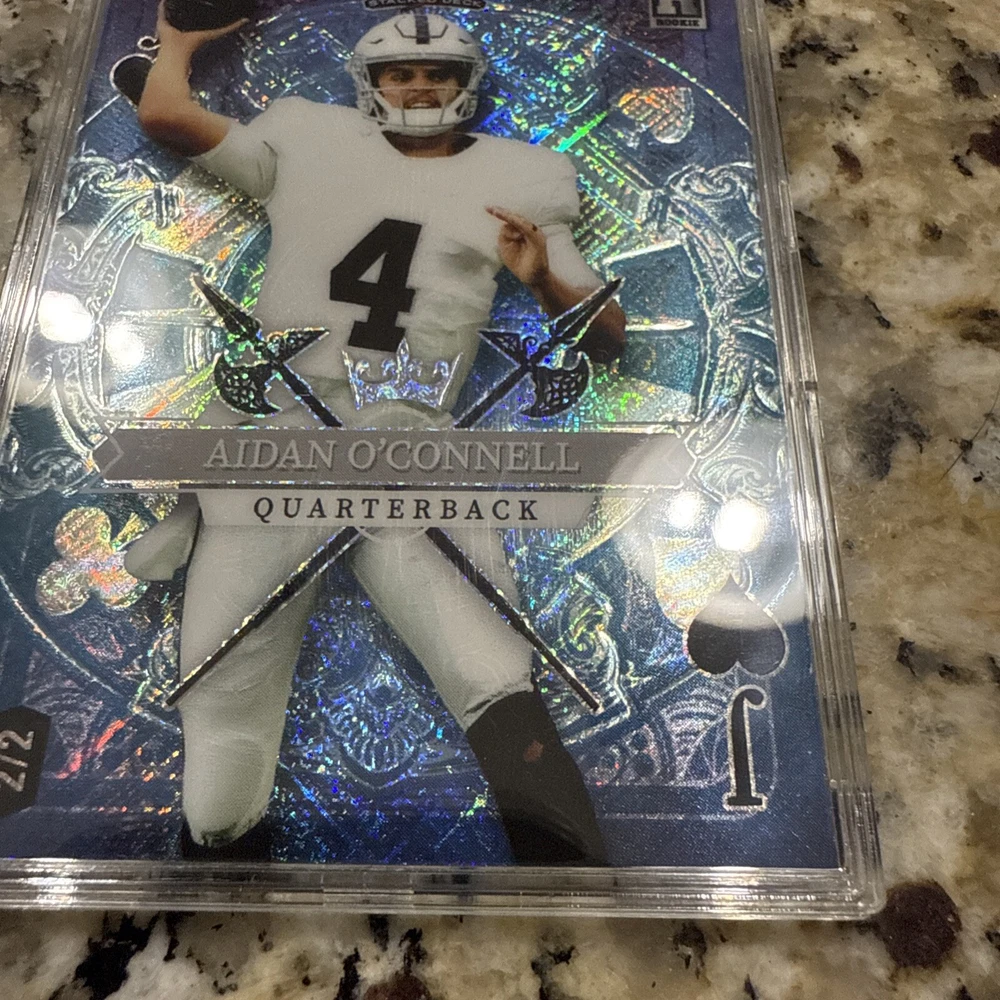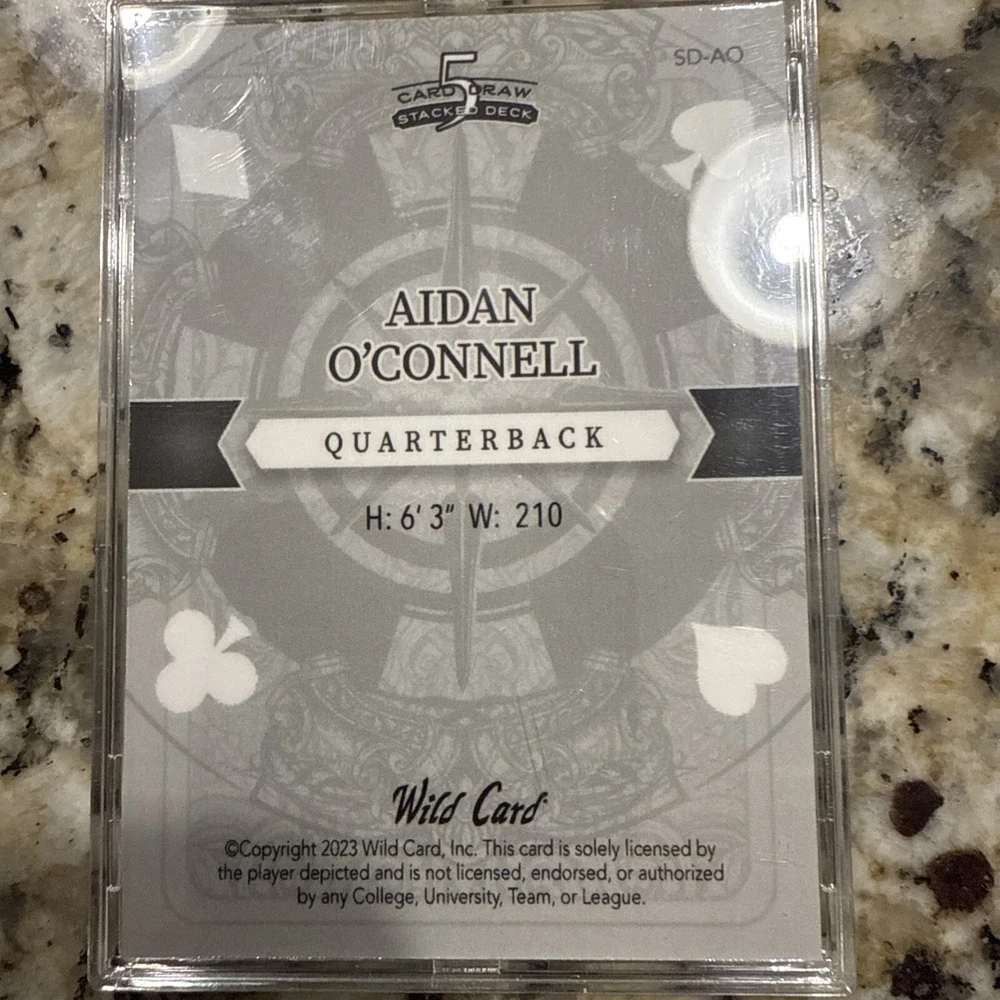 The 2023 Wild Card 5 Card Draw Stacked Deck features a rare card of Aidan O'Connell, representing the Jack of Hearts in a limited print run of only 2 cards. This sports trading card is part of a set by Wild Card for the 2023 season, showcasing O'Connell as a rookie player for both the Las Vegas Raiders and Purdue Boilermakers. The card is in near mint or better condition and includes features like being serial numbered and a parallel/variety card.