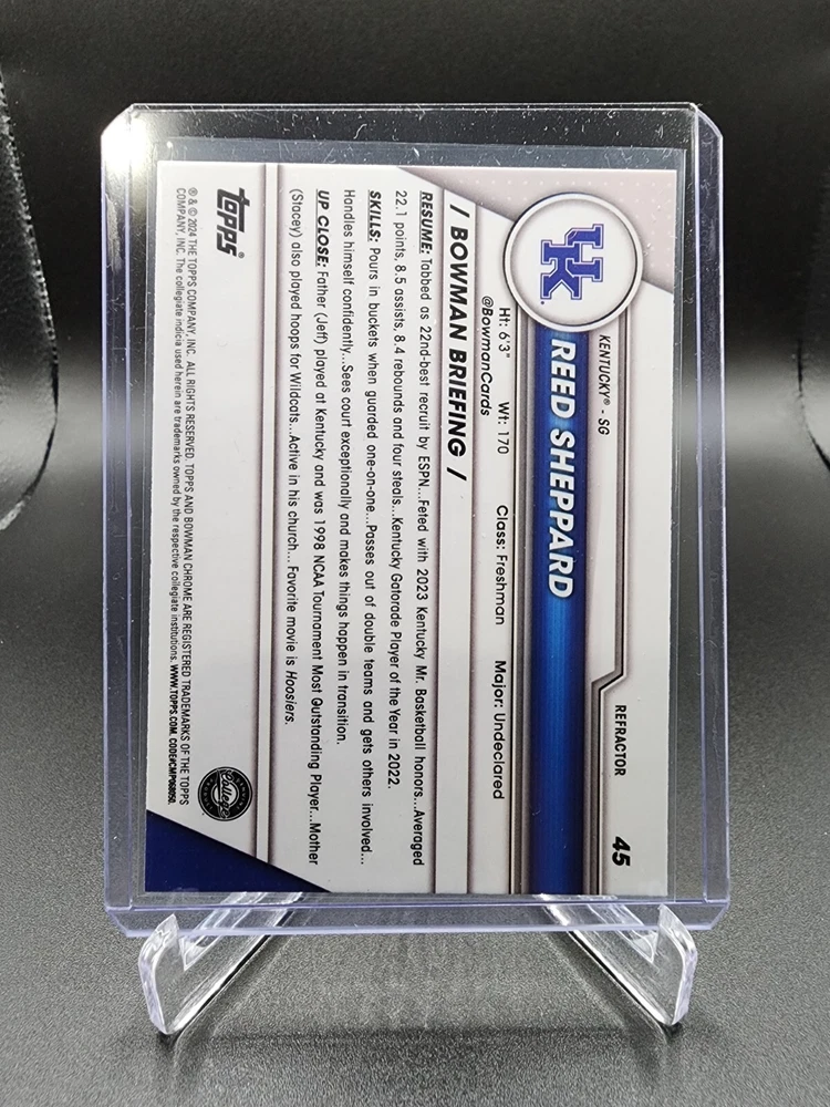 Manufacturer: Topps Set: 2023-24 Bowman University Chrome Type: Sports Trading Card Features: Parallel/Variety, Base Set, Rookie Sport: Basketball League: National Collegiate Athletic Association (NCAA) Player/Athlete: Reed Sheppard Parallel/Variety: Refractor Card Number: 45 Season: 2023-24