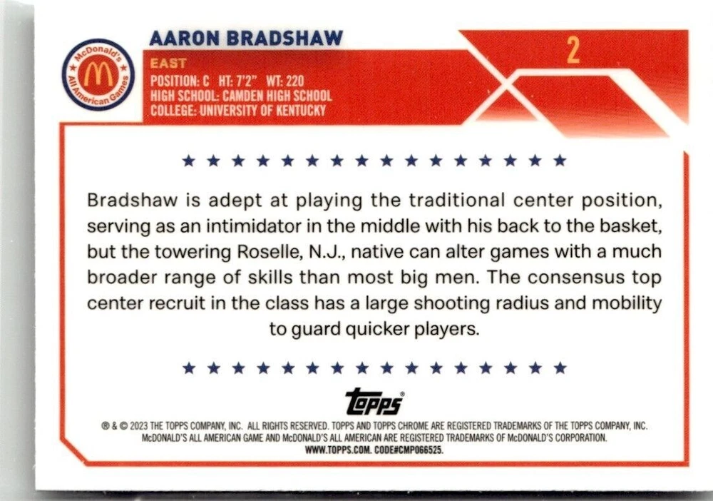 Sport: Basketball Graded: No Card Name: 2023-24 CHROME MCDONALD'S ALL AMERICAN AARON BRADSHAW UNIVERSITY Player/Athlete: Aaron Bradshaw Autographed: No Year Manufactured: 2023 Character: Aaron Bradshaw Original/Licensed Reprint: Original Season: 2023 Game: Unspecified Team: University of Kentucky Set: Topps Chrome McDonald's All American Type: Sports Trading Card Vintage: No Card Number: 2 Manufacturer: Topps Franchise: Basketball Card Size: 3¾" x 2½"