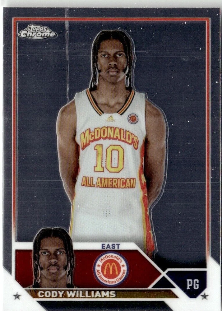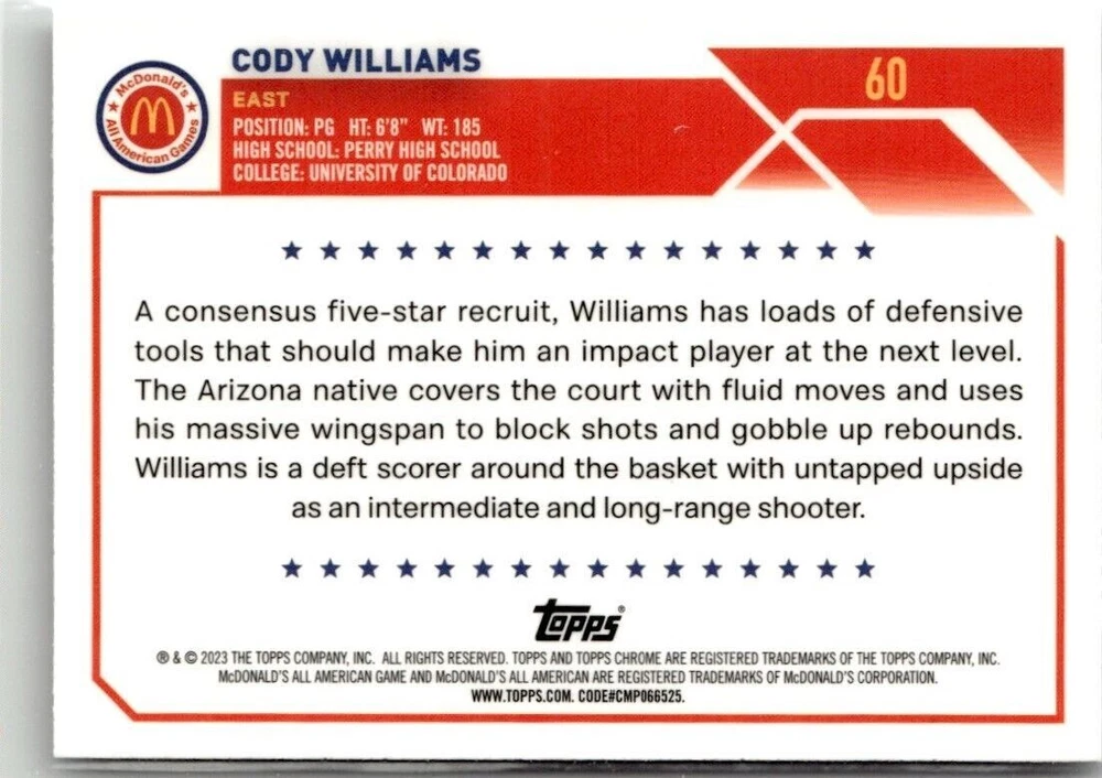 Original/Licensed Reprint: Original Type: Sports Trading Card Set: Topps Chrome McDonald's All American Year Manufactured: 2023 Franchise: Basketball Character: Cody Williams Game: Unspecified Team: University of Colorado Graded: No Sport: Basketball Vintage: No Card Name: 2023-24 CHROME MCDONALD'S ALL AMERICAN CODY WILLIAMS UNIVERSITY O Autographed: No Card Size: 3½" x 2½" Manufacturer: Topps Player/Athlete: Cody Williams Card Number: 60 Season: 2023