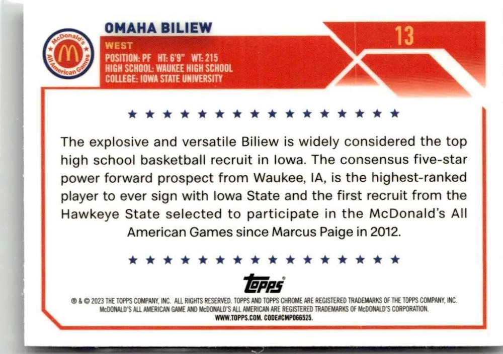 2023-24 CHROME MCDONALD'S ALL AMERICAN OMAHA BILIEW IOWA STATE UNIVERSITY #13