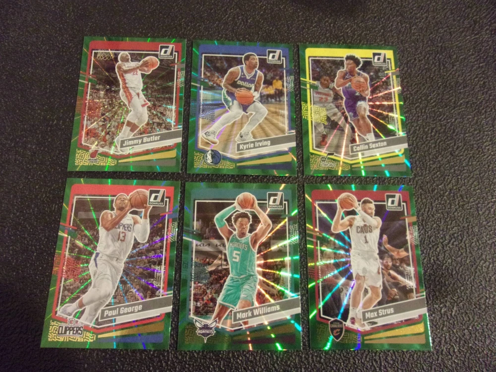 You Are Bidding On A (34) Card Lot Of 2023-24 Donruss Basketball Cards All Are Inserts Or Parallels You Will Get The Exact Cards Pictured (1) HOLO RED & GREEN LASER SERIAL #'ed /75 #166 Kevin Love Serial #59/75 (6) GREEN LASER HOLO #6 Colin Sexton #48 Kyrie Irving #64 Jimmy Butler #83 Max Strus #125 Mark Williams #167 Paul George (2) "MAGICIANS" INSERT CARDS #6 Trae Young (2X) (3) "BOMB SQUAD!" INSERT CARDS #5 Devin Booker #11 Donovan Mitchell #12 Damian Lillard (4) "COMPLETE PLAYERS" INSERT CARDS #6 Kawhi Leonard #7 Damian Lillard (2X) #9 Kevin Durant (10) "FRANCHISE FEATURES" INSERT CARDS #2 Mikal Bridges #3 Joel Embid #7 Jalen Brunson #17 Anthony Edwards (2X) #18 Shai Gilgeous-Alexander #20 Keyonte George (ROOKIE) #22 Paul George (2X) #24 De'Aaron Fox (8) "GREAT X-PECTATIONS" INSERT CARDS #7 Nick Smith Jr (ROOKIE) #9 Taylor Hendricks (2X) (ROOKIE) #13 Jaime Jaquez Jr (3X) (ROOKIE) #18 Cason Wallace (ROOKIE) #20 Dereck Lively II (ROOKIE) All Are In Nice Shape & Will Ship In Individual Soft Sleeves USPS Ground Advantage With Tracking In A Bubble Mailer
