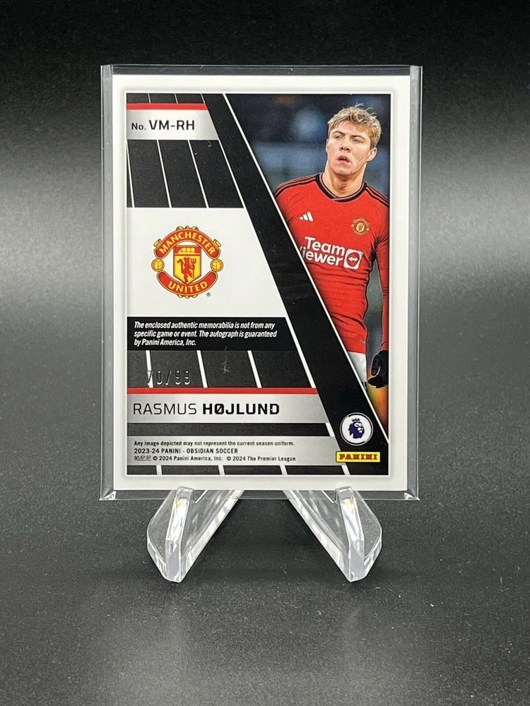 This 2023-24 Panini Obsidian trading card features Rasmus Hojlund, a soccer player from Denmark who currently plays for Manchester United in the Premier League. The card is autographed and has a patch parallel/variety with a print run of 06/49, making it a rare find for collectors. In addition, the card is serial numbered and comes from the 2023-24 season. It is a sports trading card and is not graded. The card number is DJ-RH and it is manufactured by Panini in Denmark. This item is perfect for fans of soccer and trading card collectors alike.