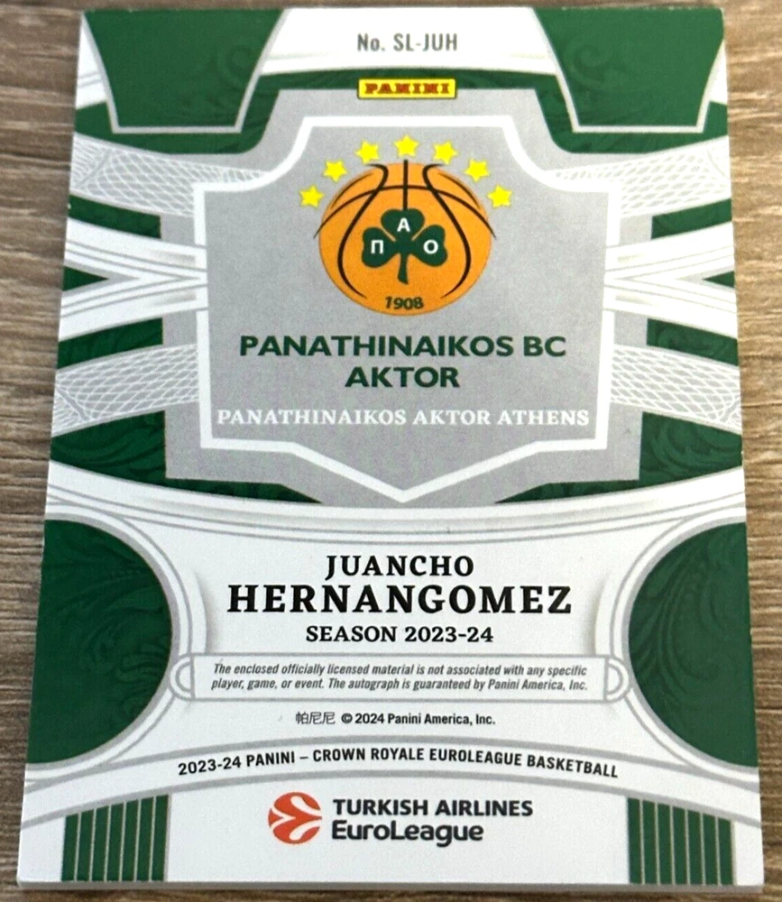 The product is a 2023-24 Panini Crown Royale trading card featuring Juancho Hernangomez from Panathinaikos in the EuroLeague. It is autographed by Hernangomez and authenticated by Panini Authentic. The card is numbered 76 out of 99, making it a limited edition collectible for basketball fans. This rare card combines a jersey relic with an autograph of the player, making it a desirable addition to any sports trading card collection.