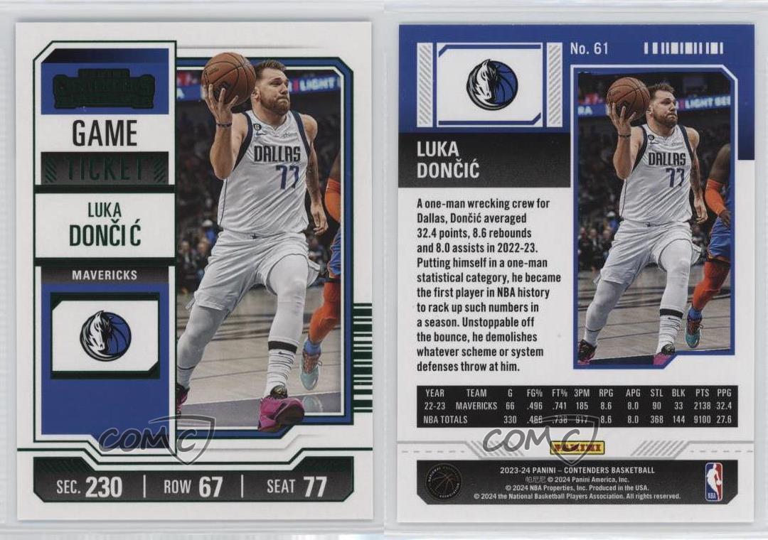 2023-24 Panini Contenders - [Base] - Green Game Ticket #61 Luka Doncic - Basketball Card - Featuring the Dallas Mavericks - Featuring Luka Doncic Search for more: 2023-24 Panini Contenders Search for more: 2023-24 Panini Contenders - [Base] - Green Game Ticket View all of our Listings Auctions Buy It Now About Us Located in the beautiful Pacific Northwest, COMC (Check Out My Cards) is the world's largest consignment service for trading card singles. More than 10,000 people have used our consignment service to list over 50 million trading cards. We currently house 20 million cards, each listed for sale with front and back images of the actual card. Find out how we can help you consign your items on eBay by contacting us through eBay messaging. COMC -- "The Safe & Easy Way to Buy & Sell" Representative Image - Select Specific Item above to see image of actual item Representative Image - Select Specific Item above to see image of actual item Raw Condition for Modern Cards Unless otherwise noted, raw modern cards are listed in Near Mint-Mint condition or better. A NM-MT card appears to be Mint at first glance, but upon closer inspection, may exhibit some of the following: minor print defects (e.g. roller marks, print line, dimple), minor scratches, slight edge wear, and slight corner wear. Centering is clearly visible in the images provided and does not factor into our condition assessment. Raw Condition for Vintage Cards Unless otherwise noted, raw vintage cards are listed in Excellent condition or better. An EX card may exhibit some of the following: minor rounding of corners, surface wear, print defects, light scratches, and slight edge wear/chipping. Centering is clearly visible in the images provided and does not factor into our condition assessment. Domestic Shipping Combined shipping for multiple items is available. To receive combined shipping, please ensure all desired items are in your eBay shopping cart before proceeding to checkout. eBay limits orders to 40 items per order. We automatically combine multiple orders placed on the same day. If you place multiple orders on the same day, please contact us to request a refund of applicable shipping costs. Signature confirmation may be required on invoices over $400. Raw cards are shipped in toploaders. International Shipping COMC offers eBay's International Shipping (EIS) for international orders under $2,500* (see country exceptions below). All duties and import fees are paid at checkout; in the rare event that there are additional import fees upon delivery, these are borne by the buyer. EIS packages route through a shipping hub in Erlanger, KY before shipping to their final destination. Please note that EIS does not allow for combined shipments. The shipping rates are determined by eBay and cannot be adjusted. *Maximum sale price exceptions: Colombia, Kuwait ($2,000); Taiwan ($1,539); Chile, Costa Rica, Guatemala, Honduras, Trinidad and Tobago ($1,000); Antigua and Barbuda, Aruba, Belize, Dominica, Grenada, Philippines, Saint Kitts and Nevis, Saint Lucia, Montserrat, Turks and Caicos Islands ($500); Dominican Republic, El Salvador ($200). Please request a shipping quote through eBay messaging for orders that exceed the maximum sale price supported by eBay's International Shipping. You will be responsible for all duties and import fees for international orders shipped outside the EIS. Raw cards are shipped in toploaders. Payment COMC does not accept offers on our cards through our eBay storefront. COMC utilizes eBay’s managed payments system. If you are experiencing difficulties making a payment, please contact eBay for assistance. Return Policy Returns are only accepted on the rare occasion the item is not as described. If you are making a return, please initiate the return process through eBay so a mailing label can be provided for you. Prior to listing, our expert team carefully assessed this item to represent it accurately. Please review the description and high-definition images prior to purchasing to ensure this item meets your satisfaction. We welcome you to contact us if you have further questions about this item. Trust and Integrity COMC carefully assesses each item consigned to us to prevent fraudulent items from entering the marketplace. If you believe an item offered on COMC may be fraudulent, please contact us with details so we can investigate the issue. Items we determine are outside our supported items policy may be removed. Last Modified: 11/7/2024 1:14:21 PM PDT