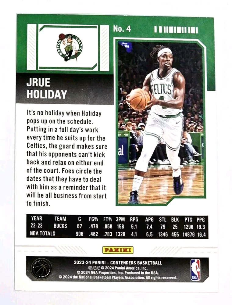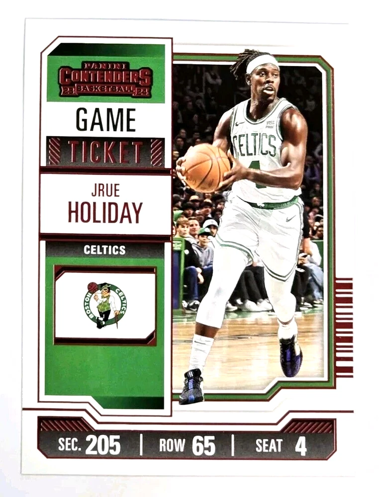 Here is a 2023-24 Panini Contenders Red Game Ticket basketball card of Jrue Holiday . Card #4 is in m/nm condition. Card will be shipped in an ultra pro top loader. Ship fast! Make an offer! Combined shipping available. Please take a good look at the photos. Any questions feel free to let me know. Don't forget to check out my other items that I have listed. Aloha and thank you. 966