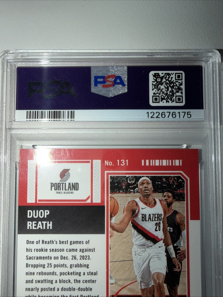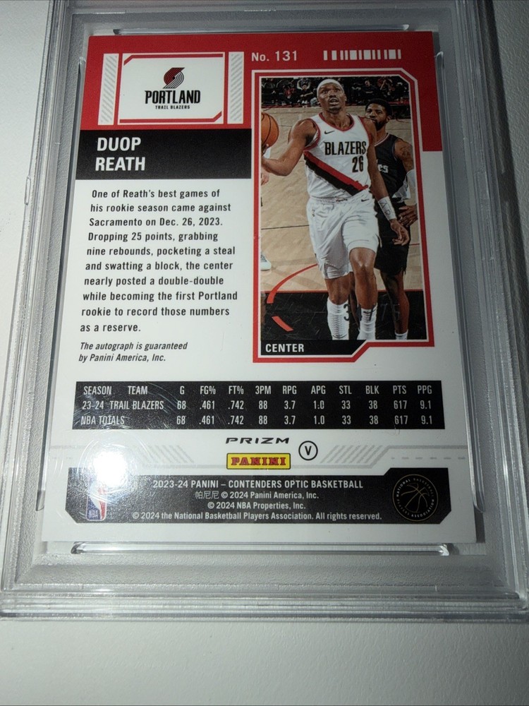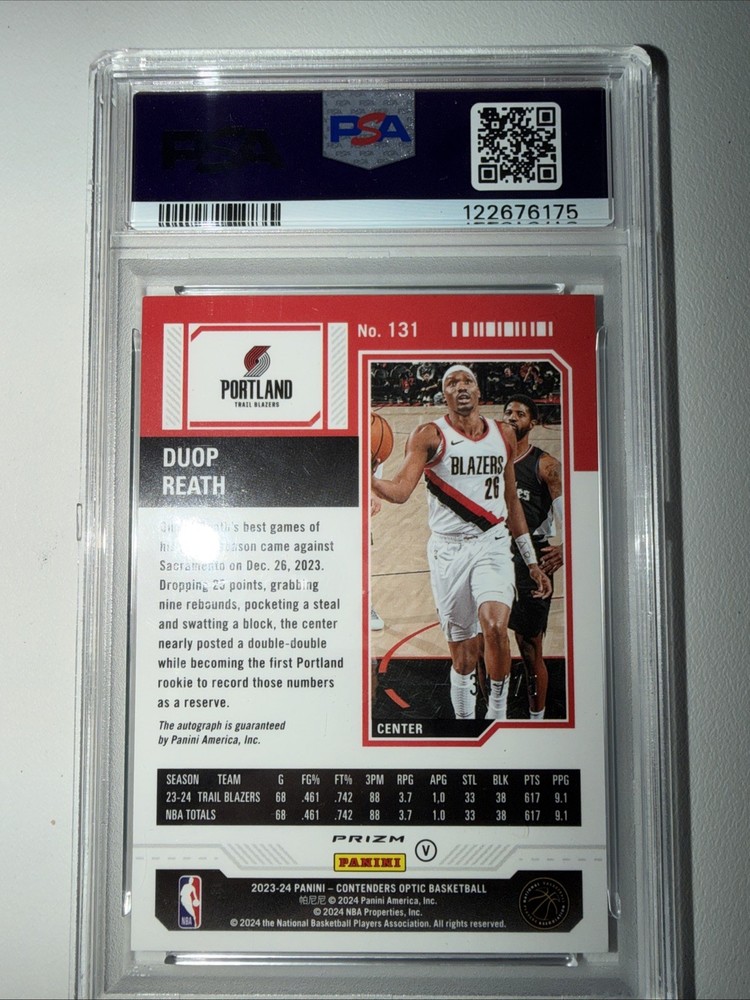 The 2023-24 Panini Contenders Optic - Rookie Ticket Duop Reath #34 Green Prizm /75 is a highly sought-after sports trading card featuring Duop Reath of the Portland Trail Blazers. This limited edition card is part of the 2023-24 Panini Contenders Optic set and is graded as a 9 by Professional Sports Authenticator (PSA). With only 75 copies in existence, this Green Prizm parallel variety card is a valuable addition to any basketball card collection, especially for fans of the NBA and collectors of rookie cards.
