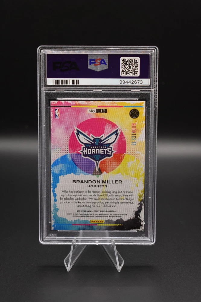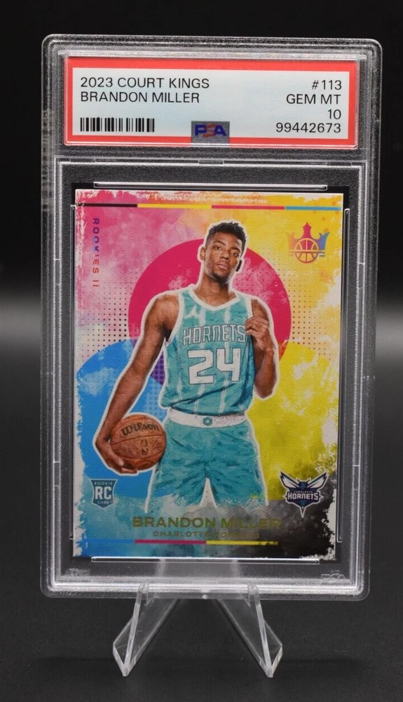 Brandon Miller 2023 Panini Court Kings Rookies II #113 Rookie RC PSA 10 All orders ship within 24 hours of payment. For Graded Cards you will receive the card(s) listed in the title and pictured in the scan, because at times we may have duplicates of the exact same grade card, you will receive the exact card and grade listed but certification number might be different. Graded cards will be put in a graded sleeve, wrapped in cardboard, and shipped in bubble mailer to ensure it arrives in pristine condition. For Ungraded Single Cards you will receive the exact card(s) listed in the title and pictured. Ungraded Single cards over $20 will be shipped the same way as graded cards Ungraded Single cards under $20 will be shipped in a toploader and team bag using eBay standard envelope, if you would prefer to have it shipped with more protection in bubble mailer, please send us a message and we can provide an updated shipping quote for you. RETURN POLICY : We allow returns with full refunds but do not offer partial refunds. Returns are available to our customers if they did not get the item they are intended to receive. They are not for them to buy and decide they do not want them. 1. Items returned because of damage, missing parts, wrong item sent, will be given full refunds 2. Items returned because of buyers remorse, changed my mind, found better price, just didn't like it will by charged a minimum of 20% restocking fee SALES TAX : Sales tax is charged in accordance w/all of eBay's policies and the state where the item is being sent. ADDITIONAL INFORMATION : We are actively accepting ebay consignments, please message us for any inquiries. THANKS FOR LOOKING AND PLEASE MESSAGE US WITH ANY QUESTIONS! Check out our other eBay listings by clicking this link: TopShop828 eBay Store !