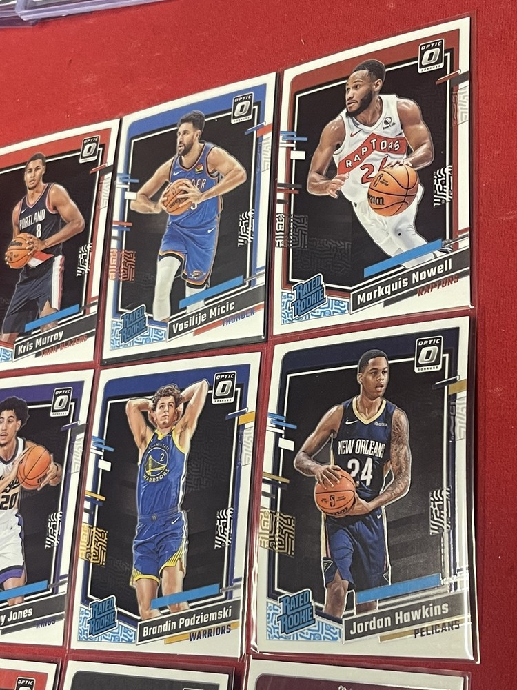 Get ready to enhance your collection with this amazing lot of 9 Panini Donruss Optic Basketball Cards featuring the Rated Rookie Cards from the 2023-24 season. The cards are of standard size and manufactured in the United States. They are original and licensed reprints, not vintage, and are in English. The lot includes cards from various NBA teams such as the Golden State Warriors, Cleveland Cavaliers, Atlanta Hawks, Boston Celtics, Dallas Mavericks, Phoenix Suns, and Los Angeles Lakers. The cards are from the base set and are perfect for any basketball fan or collector. Don't miss this chance to get your hands on these cheap and amazing cards!