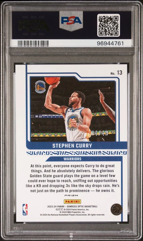 Elevate your basketball card collection with the 2023 Donruss Optic Elite Dominators Blue #13, featuring the sharp-shooting Stephen Curry of the Golden State Warriors. This limited edition card, with a print run of just 49, captures the essence of the NBA superstar and is a must-have for fans and collectors alike. The card boasts a sleek Optic parallel design, complete with serial numbering, ensuring its uniqueness and collectible value. Crafted with quality in mind, this sports trading card is an original release from Donruss for the 2023-24 season and comes in standard card size with a 35 Pt. thickness. It is not autographed, preserving the integrity of the card's design. Highlighting Curry's remarkable presence in the sport, this card is a standout piece that celebrates the athlete's legacy within the National Basketball Association.