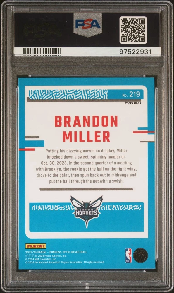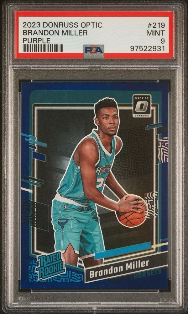 Features: Parallel/Variety, Base Set, Rookie League: National Basketball Association (NBA) Series: Panini Donruss Optic Subset: Rated Rookie Sport: Basketball Team: Charlotte Hornets Season: 2023-24 Card Number: 219 Set: 2023-24 Panini Donruss Optic brand: Panini Additional Description: Rated Rookie - Brandon Miller Manufacturer: Panini Parallel/Variety: Purple Prizm Player/Athlete: Brandon Miller