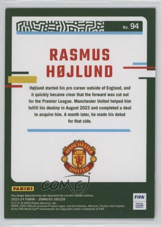 2023-24 Panini Donruss - [Base] - Red #94 Rasmus Hojlund Qty Made: 99 - Soccer Card - Featuring the Manchester United FC - Featuring Rasmus Hojlund Search for more: 2023-24 Panini Donruss Search for more: 2023-24 Panini Donruss - [Base] - Red View all of our Listings Auctions Buy It Now About Us Located in the beautiful Pacific Northwest, COMC (Check Out My Cards) is the world's largest consignment service for trading card singles. More than 10,000 people have used our consignment service to list over 50 million trading cards. We currently house 20 million cards, each listed for sale with front and back images of the actual card. Find out how we can help you consign your items on eBay by contacting us through eBay messaging. COMC -- "The Safe & Easy Way to Buy & Sell" Representative Image - Select Specific Item above to see image of actual item Representative Image - Select Specific Item above to see image of actual item Raw Condition for Modern Cards Unless otherwise noted, raw modern cards are listed in Near Mint-Mint condition or better. A NM-MT card appears to be Mint at first glance, but upon closer inspection, may exhibit some of the following: minor print defects (e.g. roller marks, print line, dimple), minor scratches, slight edge wear, and slight corner wear. Centering is clearly visible in the images provided and does not factor into our condition assessment. Raw Condition for Vintage Cards Unless otherwise noted, raw vintage cards are listed in Excellent condition or better. An EX card may exhibit some of the following: minor rounding of corners, surface wear, print defects, light scratches, and slight edge wear/chipping. Centering is clearly visible in the images provided and does not factor into our condition assessment. Domestic Shipping Combined shipping for multiple items is available. To receive combined shipping, please ensure all desired items are in your eBay shopping cart before proceeding to checkout. eBay limits orders to 40 items per order. We automatically combine multiple orders placed on the same day. If you place multiple orders on the same day, please contact us to request a refund of applicable shipping costs. Signature confirmation may be required on invoices over $400. Raw cards are shipped in toploaders. International Shipping COMC offers eBay's International Shipping (EIS) for international orders under $2,500* (see country exceptions below). All duties and import fees are paid at checkout; in the rare event that there are additional import fees upon delivery, these are borne by the buyer. EIS packages route through a shipping hub in Erlanger, KY before shipping to their final destination. Please note that EIS does not allow for combined shipments. The shipping rates are determined by eBay and cannot be adjusted. *Maximum sale price exceptions: Colombia, Kuwait ($2,000); Taiwan ($1,539); Chile, Costa Rica, Guatemala, Honduras, Trinidad and Tobago ($1,000); Antigua and Barbuda, Aruba, Belize, Dominica, Grenada, Philippines, Saint Kitts and Nevis, Saint Lucia, Montserrat, Turks and Caicos Islands ($500); Dominican Republic, El Salvador ($200). Please request a shipping quote through eBay messaging for orders that exceed the maximum sale price supported by eBay's International Shipping. You will be responsible for all duties and import fees for international orders shipped outside the EIS. Raw cards are shipped in toploaders. Payment COMC does not accept offers on our cards through our eBay storefront. COMC utilizes eBay’s managed payments system. If you are experiencing difficulties making a payment, please contact eBay for assistance. Return Policy Returns are only accepted on the rare occasion the item is not as described. If you are making a return, please initiate the return process through eBay so a mailing label can be provided for you. Prior to listing, our expert team carefully assessed this item to represent it accurately. Please review the description and high-definition images prior to purchasing to ensure this item meets your satisfaction. We welcome you to contact us if you have further questions about this item. Trust and Integrity COMC carefully assesses each item consigned to us to prevent fraudulent items from entering the marketplace. If you believe an item offered on COMC may be fraudulent, please contact us with details so we can investigate the issue. Items we determine are outside our supported items policy may be removed. Last Modified: 10/20/2024 4:37:26 AM PDT