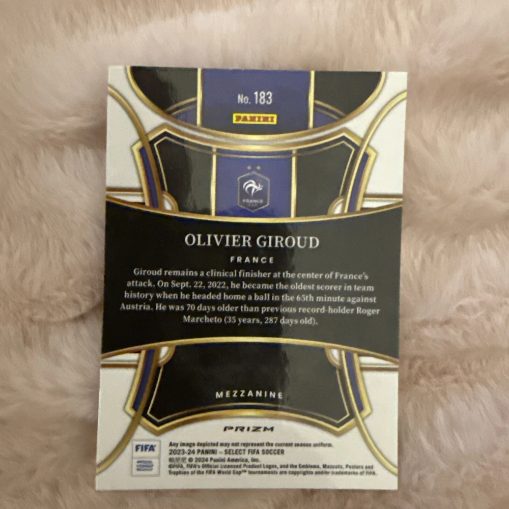 The product is a 2023-24 Panini FIFA Select trading card featuring soccer player Olivier Giroud in a Purple Mojo parallel variety. The card is numbered 183 and is in near mint or better condition. This sports trading card is part of the UEFA Champions League collection and is ideal for collectors interested in soccer trading cards, specifically those featuring Olivier Giroud.
