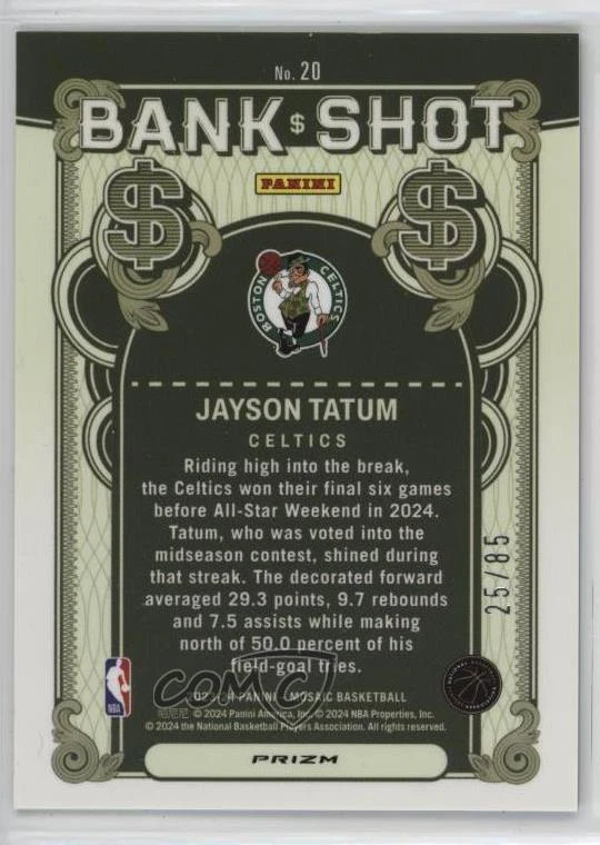 This 2023-24 Panini Mosaic sports trading card features Jayson Tatum of the Boston Celtics in a Fast Break Blue parallel/variety. The card is serial numbered 79/85 and is part of a print run of 85. It is a 2023 Panini Mosaic set card that is perfect for any basketball fan or collector. The card is in great shape and comes from a smoke-free environment. It is an insert card that is sure to make a statement in any collection. Whether you are a fan of Jayson Tatum or simply love collecting sports trading cards, this is a must-have item.