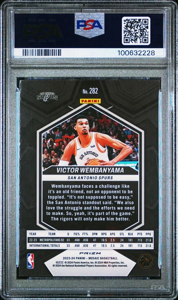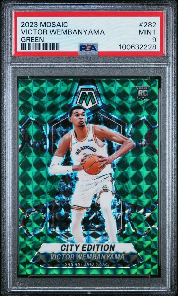 Capture a piece of basketball history with the 2023-24 Panini Mosaic Basketball Victor Wembanyama City Edition Blue Reactive card. This sought-after collectible features the potential-packed rookie in his San Antonio Spurs colors, embodying the excitement of the sport and the promise of a rising star. The Blue Mosaic parallel lends a distinctive touch to the card, making it a standout addition to any collection.