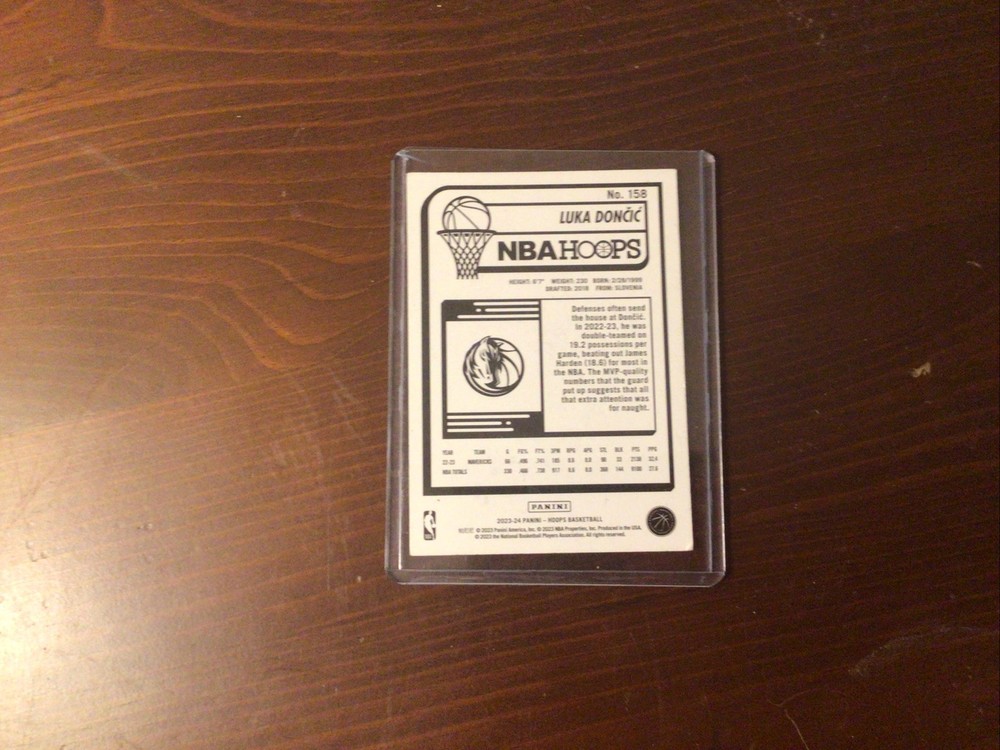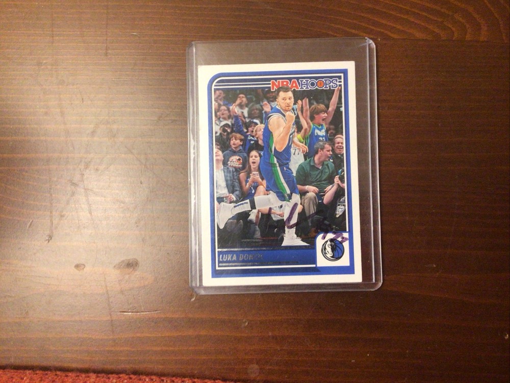 The product is a 2023-24 Panini NBA Hoops trading card featuring Luka Dončić of the Dallas Mavericks. This card is autographed by Dončić on card and is in near mint or better condition. It is an original licensed reprint made of card stock, with the card number 158 in the set. It is a sports trading card for basketball collectors and fans.