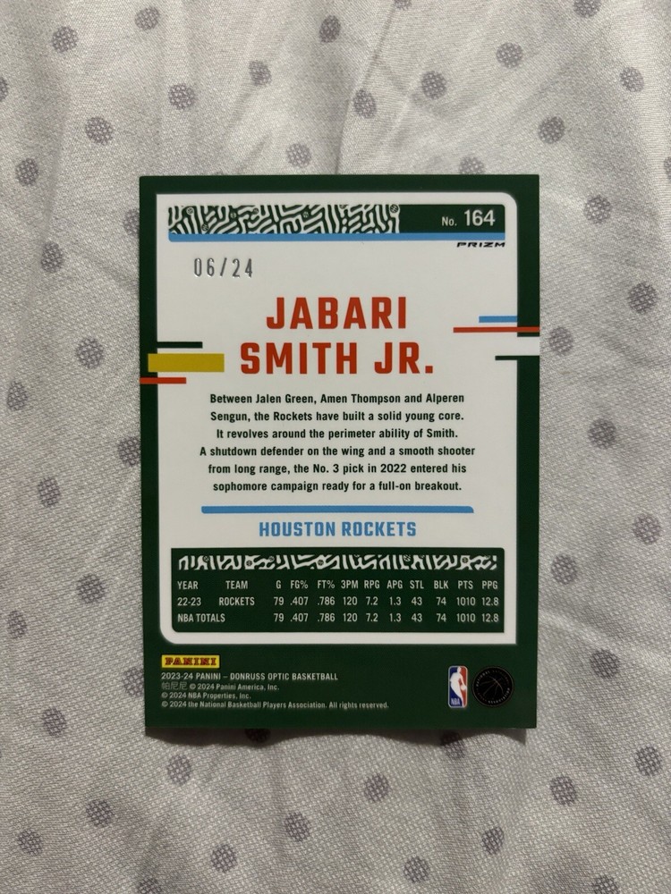 2023-24 Panini Optic Blue Choice /24 Mojo #164 Jabari Smith Jr. Houston Rockets. Condition is Ungraded. Shipped with eBay Standard Envelope for Eligible Items up to $20.
