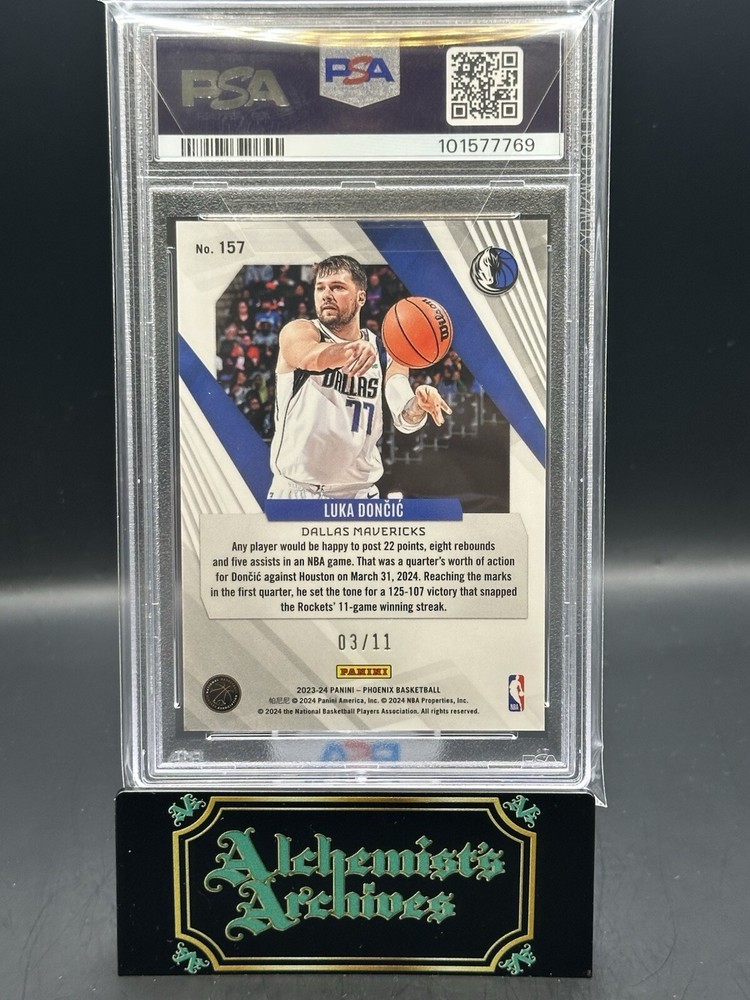 The product is a 2023-24 Panini Phoenix sports trading card featuring basketball player Luka Dončić. This specific card is a rare Red Pandora First Off The Line (FOTL) parallel, with only 11 copies produced, making it a highly sought-after short print card. The card likely showcases Dončić in either his Lakers or Mavericks jersey, adding to its appeal for collectors looking to add a unique and valuable piece to their sports trading card collection.