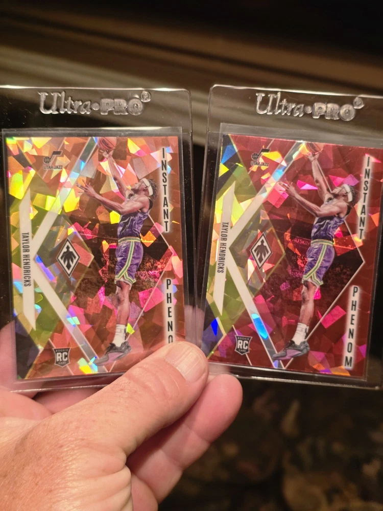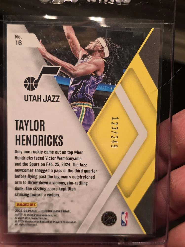 Beautiful rookie lot for Taylor Hendricks ORANGE CRACKED ICE /249 RED ICE PARALLEL 2023-24 Panini Phoenix Basketball trading card features Taylor Hendricks of the Utah Jazz. The card is part of the "Instant Phenom" set and is numbered 2 out of 249. It is a rookie card and also includes serial numbering and parallel and insert features. The card is perfect for any basketball fan or collector and is a great addition to any sports trading card collection. It is manufactured by Panini and is part of the National Basketball Association (NBA) league. Get your hands on this limited edition card today!