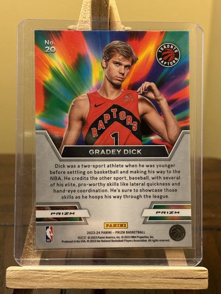 Up for sale is a 2023-24 Panini Prizm #20 Gradey Dick Instant Impact RC Raptors trading card. This card features the rising star of the Raptors basketball team and is a great addition to any sports trading card collection. It was manufactured in 2024 by Panini and is part of the Instant Impact RC insert set. This trading card is perfect for fans of the NBA, and specifically the Raptors team. It is ungraded and autographed. The card number is 20 and it also features the following aspects: League (NBA), Set (2023-24 Panini Prizm), Player/Athlete (Gradey Dick), Year Manufactured (2024), Sport (Basketball), Type (Sports Trading Card), Parallel/Variety (Instant Impact RC), Manufacturer (Panini), Features (RC), and Season (2024). Don't miss out on the chance to add this rare and valuable card to your collection.