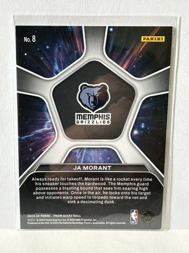 For avid collectors of sports trading cards, this 2023-24 Panini Prizm card featuring Ja Morant is a must-have. With its Deep Space Silver Prizm parallel/variety, this card is a rare find that is sure to impress. The card is part of the National Basketball Association (NBA) league and belongs to the Memphis Grizzlies team. The card is manufactured by Panini and is part of the 2023-24 Panini Prizm set. With its unique features and insert set, this sports trading card is a great addition to any collection. Its card number is 8, and it is a single trading card. Get your hands on this remarkable card and add it to your collection today!