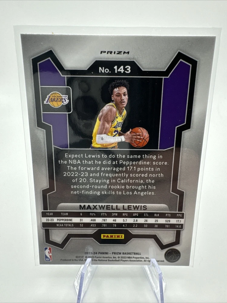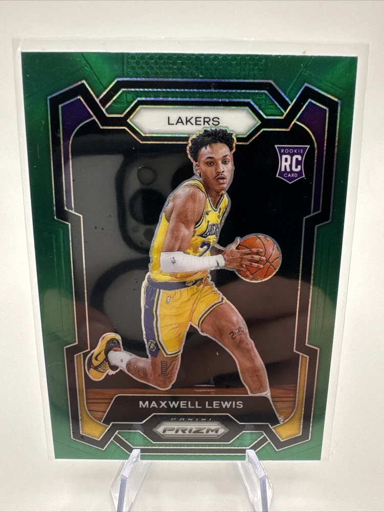 This 2023-24 Panini Prizm trading card features Maxwell Lewis of the Los Angeles Lakers. The card is part of the Green Prizm parallel variety and is limited to a short print. It also includes a hologram, checklist, and box topper. The card is perfect for collectors and fans of the National Basketball Association (NBA). The card is a sports trading card and is part of the 2023-24 Panini Prizm set. It includes features such as an exclusive rookie card, collectors edition, and is a limited edition. The card is perfect for those who love basketball and want to add a rare and valuable card to their collection.