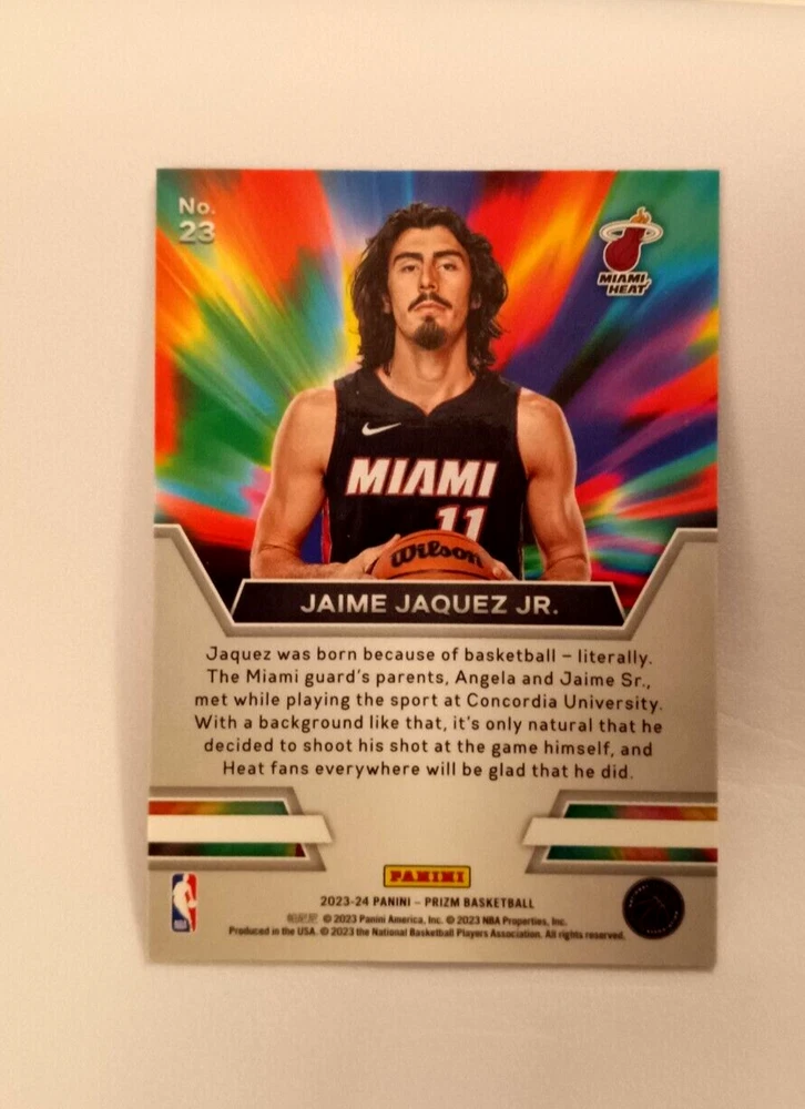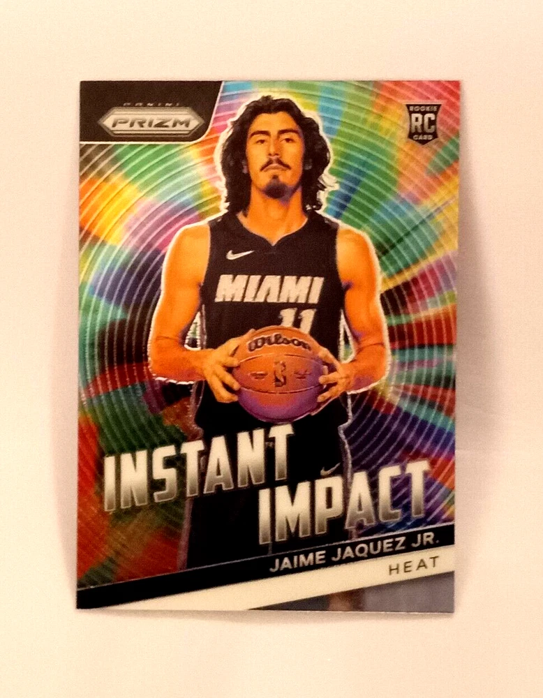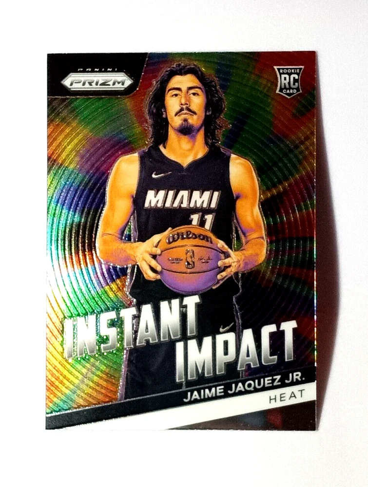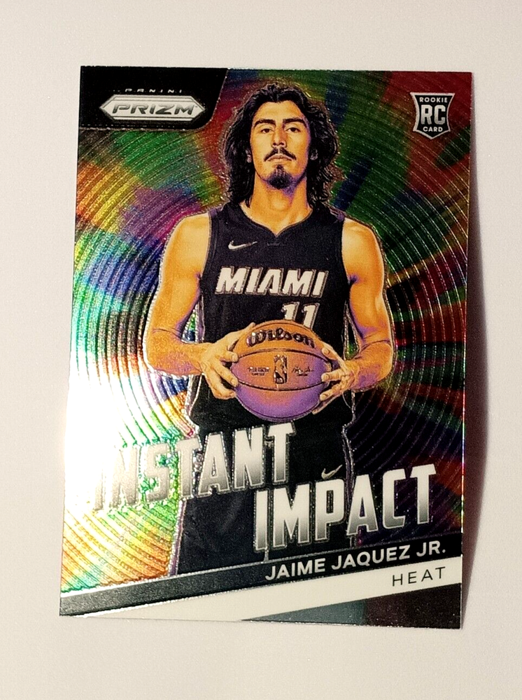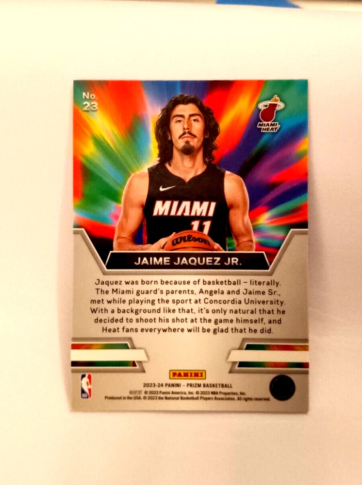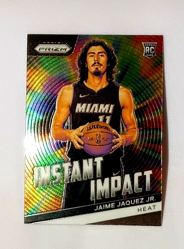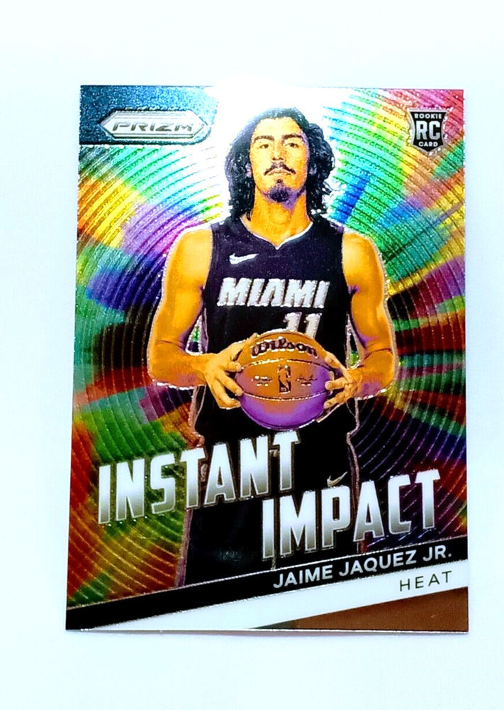 This 2023-24 Panini Prizm sports trading card features Jaime Jaquez Jr. of the Miami Heat, card number 23 in the Instant Impact insert set. It's a great addition for basketball fans and collectors, especially those who are looking for a rookie card. The card is manufactured by Panini and is part of the National Basketball Association (NBA) league. The card comes with features such as an insert and a parallel/variety of Impact. It's a must-have for those who want to complete their collection of sports trading cards. Get your hands on this 2023-24 Panini Prizm card and add it to your collection now!