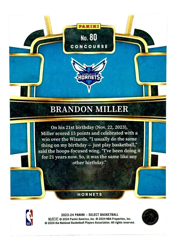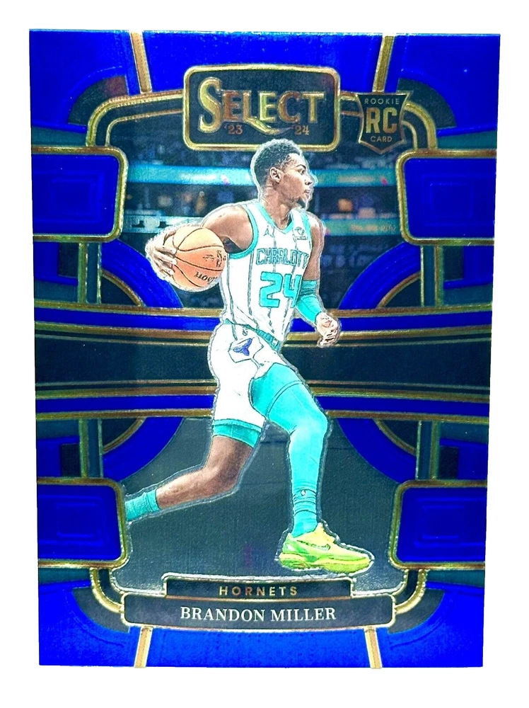 Card Size: Standard Season: 2023-24 Card Number: 80 Card Thickness: 20 Pt. Card Name: Brandon Miller Rookie Language: English Year Manufactured: 2023 Event/Tournament: NBA Finals Parallel/Variety: Blue Silver Prizm Original/Licensed Reprint: Original Material: Card Stock Set: 2023-24 Panini Select Manufacturer: Panini Player/Athlete: Brandon Miller Insert Set: Prizm Sport: Basketball Type: Sports Trading Card Country/Region of Manufacture: United States Vintage: No Team: Charlotte Hornets Print Run: SP Features: Rookie