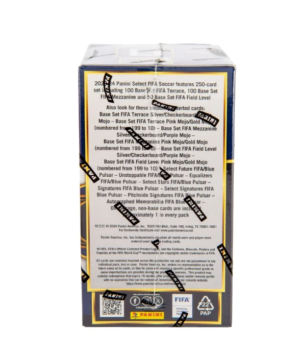 Panini presents the 2023-24 FIFA Select Soccer Trading Card Blaster Box. Each box contains 6 packs with 4 cards per pack. Look for Blaster Exclusive Purple Mojo, Gold Mojo and The New Pink Mojo Parallels! Look for autographs from some of the league's top players! Collect Base Cards from 3 Tiers- Terrace, Mezzanine, and the Ultra-Rare Field Level! Content May Vary. Features: 4 Cards per Pack 6 Packs per Box Look for Autographs!