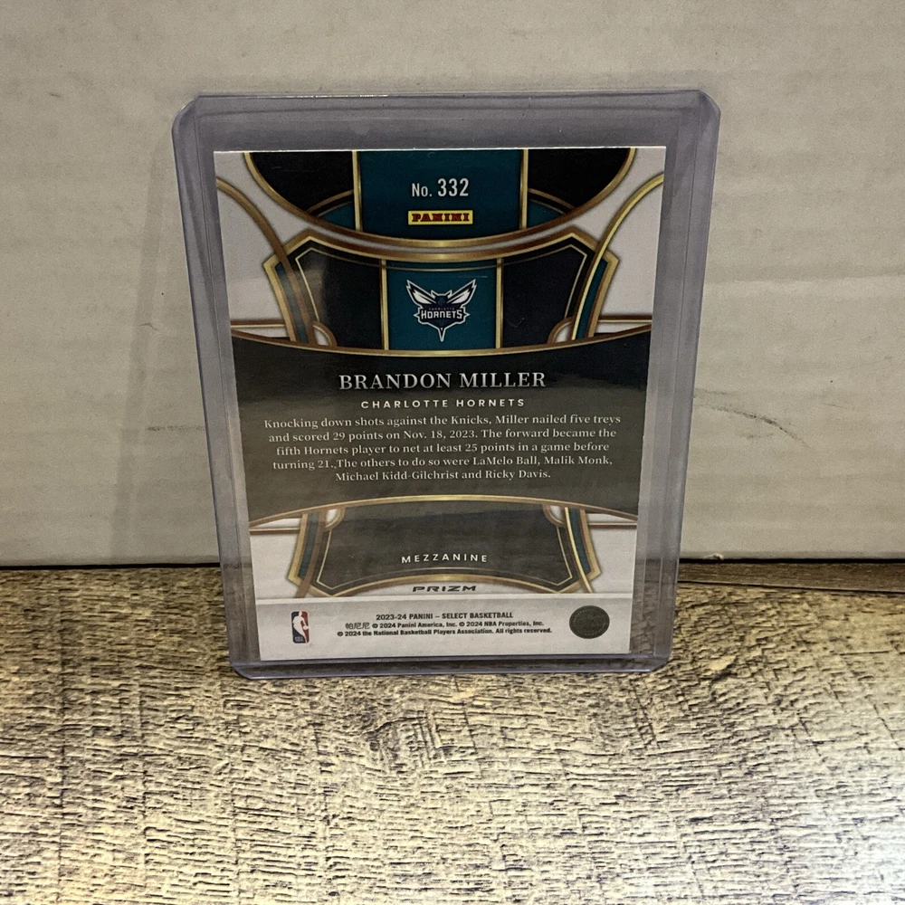 Elevate your basketball card collection with the 2023-24 Panini Select Mezzanine Level Silver Prizm #332, featuring rising star Brandon Miller. As a rookie card, it captures the beginning of what promises to be a noteworthy career with the Charlotte Hornets. The Silver Prizm parallel adds a layer of exclusivity and brilliance, making it a standout piece. Carefully crafted by Panini, this card is part of the highly sought-after base set from the National Basketball Association (NBA) series. Its unblemished design showcases the athlete's potential and the manufacturer's commitment to quality. Whether you're a fan of Brandon Miller, a collector of Hornets memorabilia, or a connoisseur of fine sports cards, this item holds value for enthusiasts and investors alike.