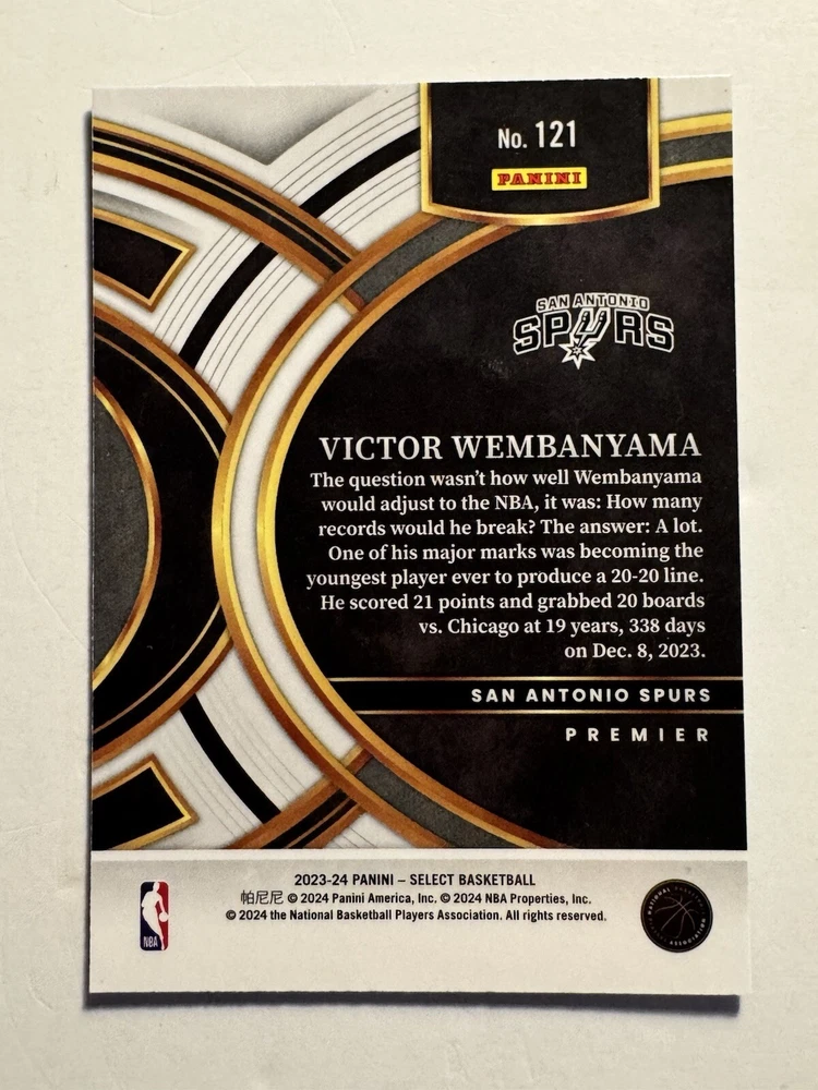The product is a 2023-24 Panini Select basketball trading card featuring Victor Wembanyama of the San Antonio Spurs. It is a blue Premier Level Rookie card numbered 121. The card is part of the 2023-24 set and manufactured in 2024 by Panini. It is a valuable addition for NBA and basketball card collectors.