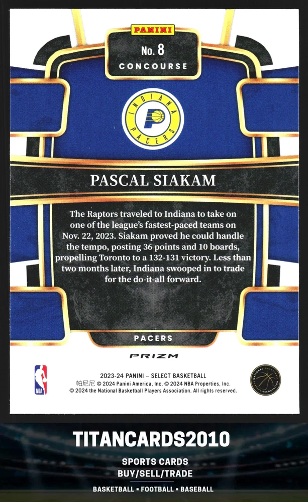 You will receive a Near Mint or Better, Pascal Siakam, 2023-24 Panini Select, Blue Cracked Ice Prizm, 8 Blue Cracked Ice Prizm Indiana Pacers card NEW CARDS LISTED DAILY ORDERS SHIP NEXT DA Y (Weekends as mail service is available) VISIT OUR STORE FOR MORE DEALS! USE THE SEARCH ICON IN THE STORE TO FIND YOUR FAVORITE TEAMS & PLAYERS! Be sure to save us as sellers to be the first to be notified when new and exciting cards are posted! Please note, we are not professional graders, and the condition of the card you purchased is highly subjective. Please refer to the high quality scans of the card you are viewing, and determine the condition of the card for yourself. Feel free to reach out with questions! All cards are in EX-NM+ condition, unless stated otherwise Chrome cards from various brands might have minor light surface scratches, which is typical with these type of cards. Any major, deep scratches or major surface issues will be noted, if present. We take pride in the condition of all of our cards, including commons. Our promise to you, is that we will not sell a card we would not buy ourselves. Of course things slip by, however customer service is our #1 Priority, and we are always here for a message for ANY, and ALL issues. Thank you very much for stopping by, feel free to reach out! - Titan (Son) & Andy (Dad)